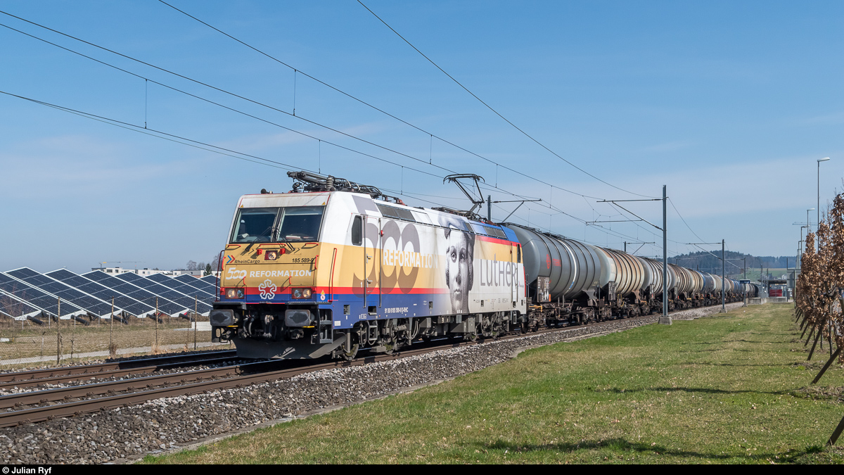 RheinCargo 185 589 mit Werbung für das 500-jährige Jubiläum der Reformation verlässt am 13. März 2017 mit einem Kesselwagenzug aus Wil SG den Güterbahnhof Winterthur in Richtung Basel - Deutschland. Julian Ryf
