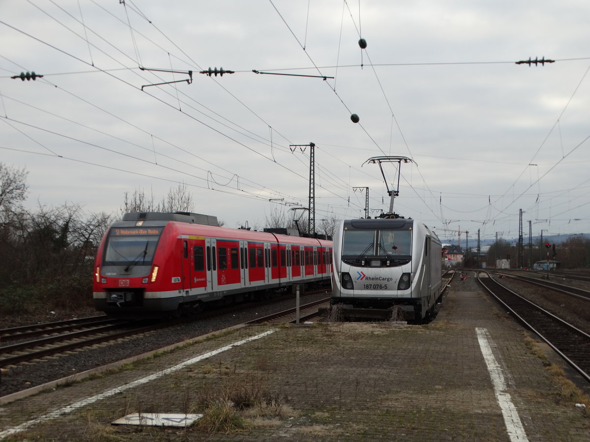 DB Regio S-Bahn Rhein Main 430 106 treifft auf RheinCargo 187 076-5 am 18.02.17 in Frankfurt am Main Höchst vom Bahnsteig aus fotografiert Daniel Oster