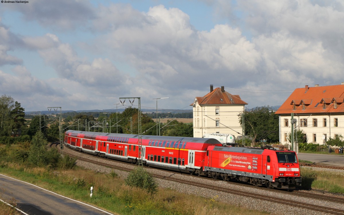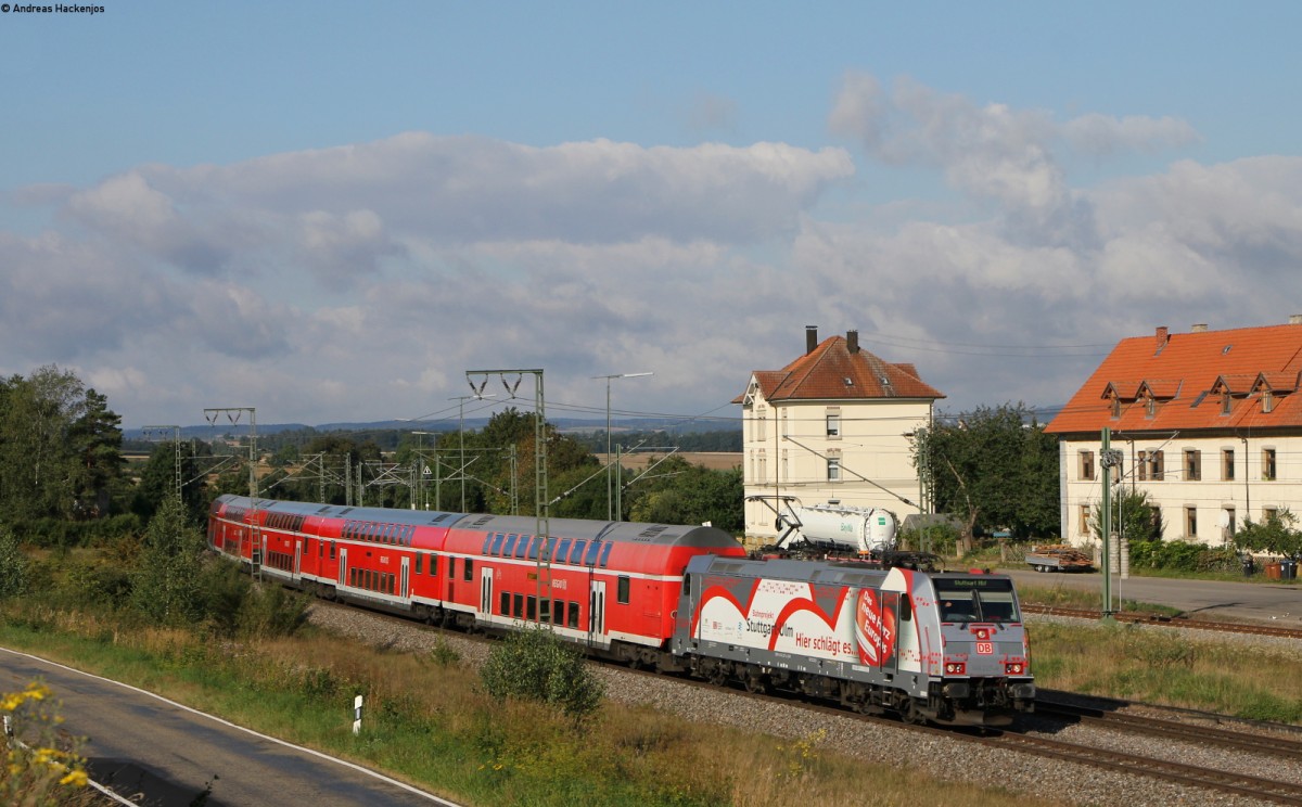 Wenn die Brücke im Hintergrund nicht wäre, dann wäre das sicher auch ein schöner Standpunkt. 115 205 mit dem IC 184 Zürich-Stuttgart bei Rottweil-Saline, 4.10.2014. Links im Hintergrund ist noch die schwäbische Alb zu erkennen. Gregor Kaercher