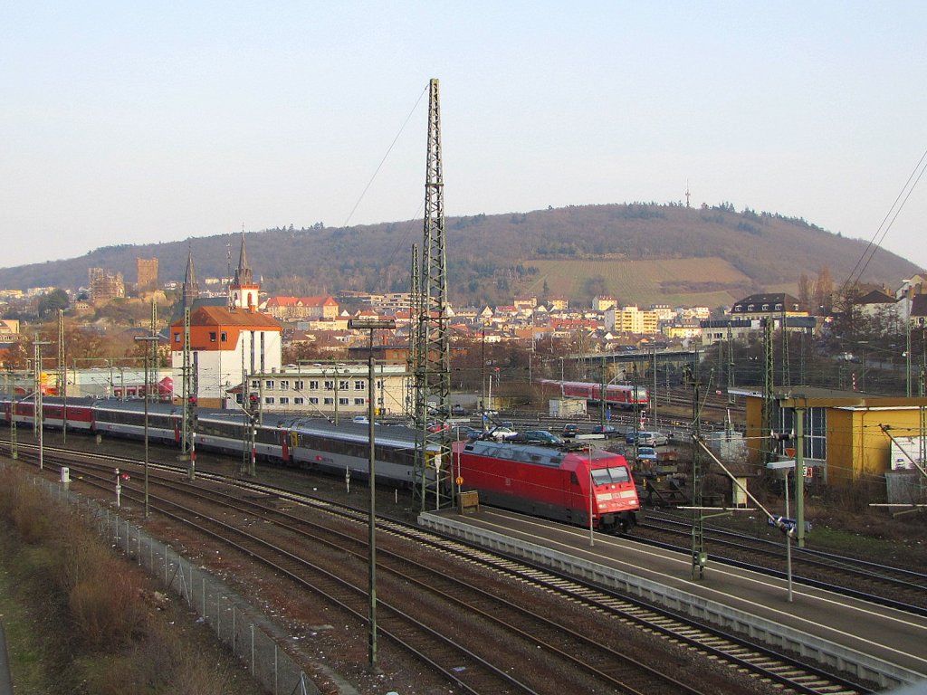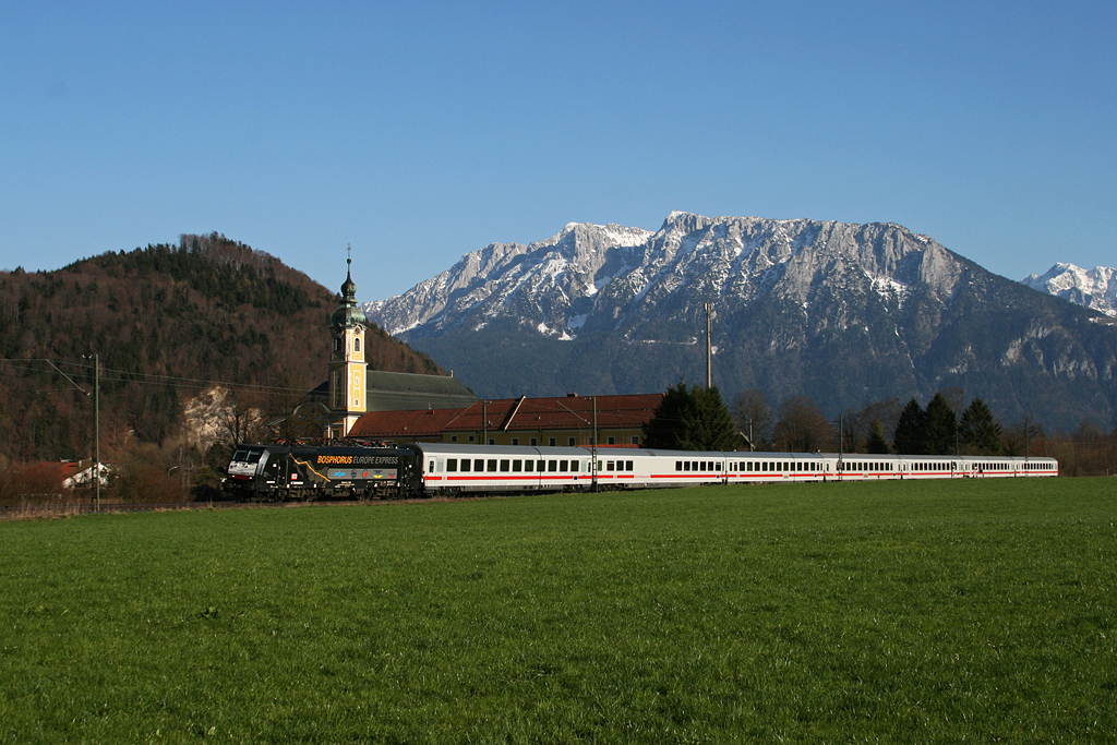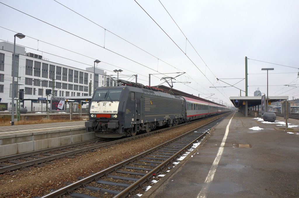 Die Wartezeit war schon fast abgelaufen, da erschien er doch noch, der EC 6 nach NRW, bei Istein. Während Silvan Wyss hinter einer Rebe sein Glück versucht, betrachtet Stefan Wohlfahrt interessiert die, an ihm vorbeifahrende 101 003-2 mit ihren SBB Wagen.