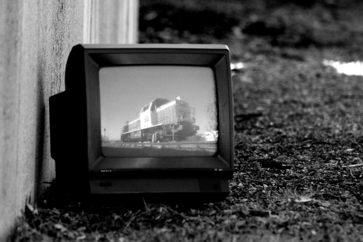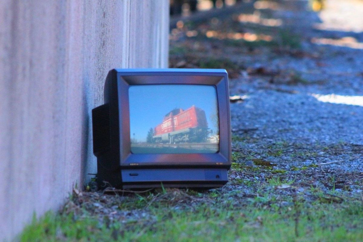 Ein anscheinend Überflüssig gewordener Fernseher steht einsam und verlassen neben den Geleisen des Bahnhofes Deutschlandsberg während DH 1100.2 vom beladenen Abraumzug rollt.