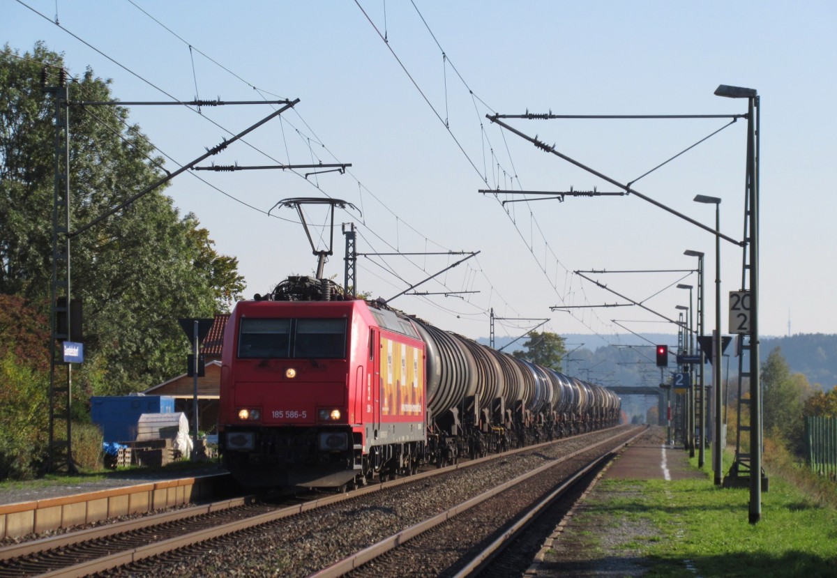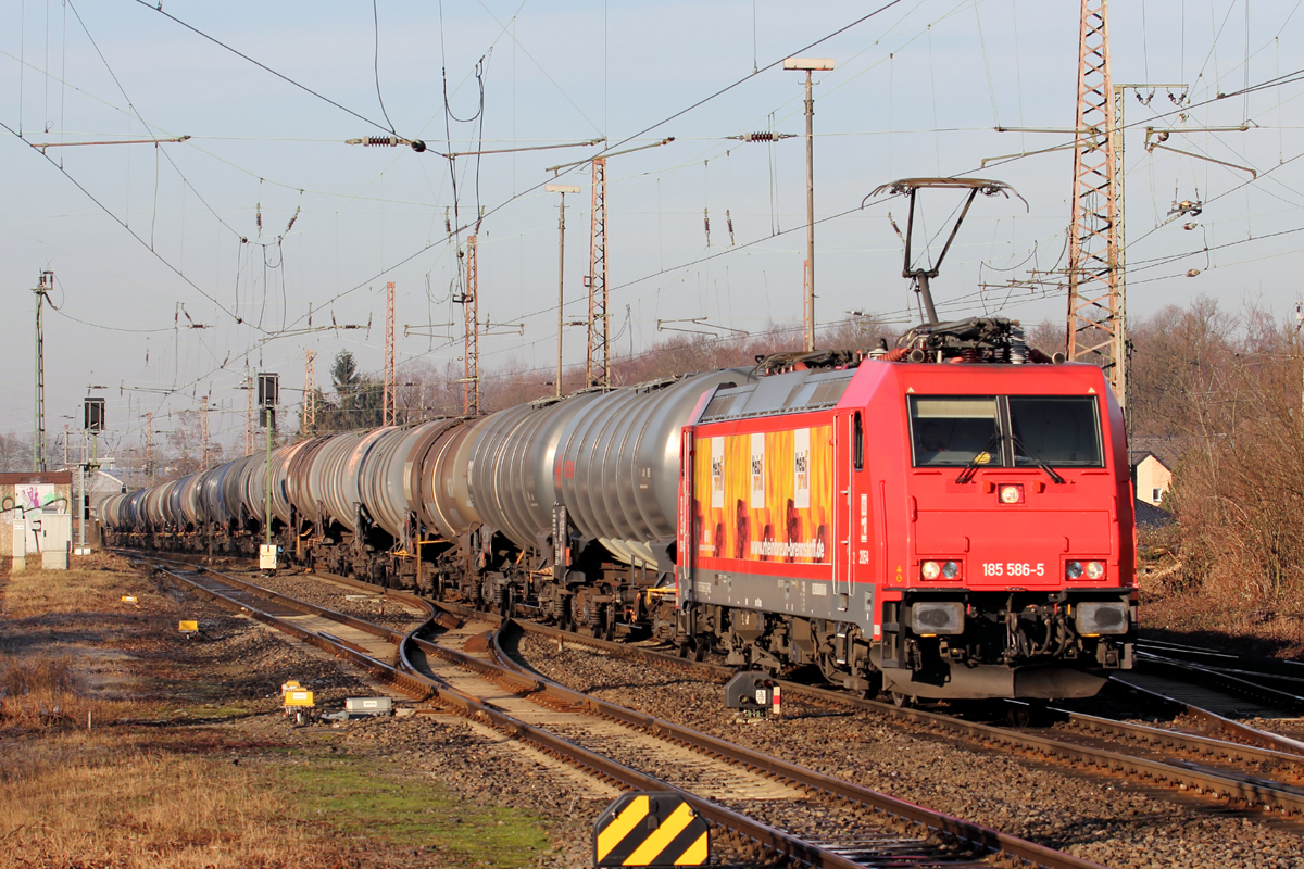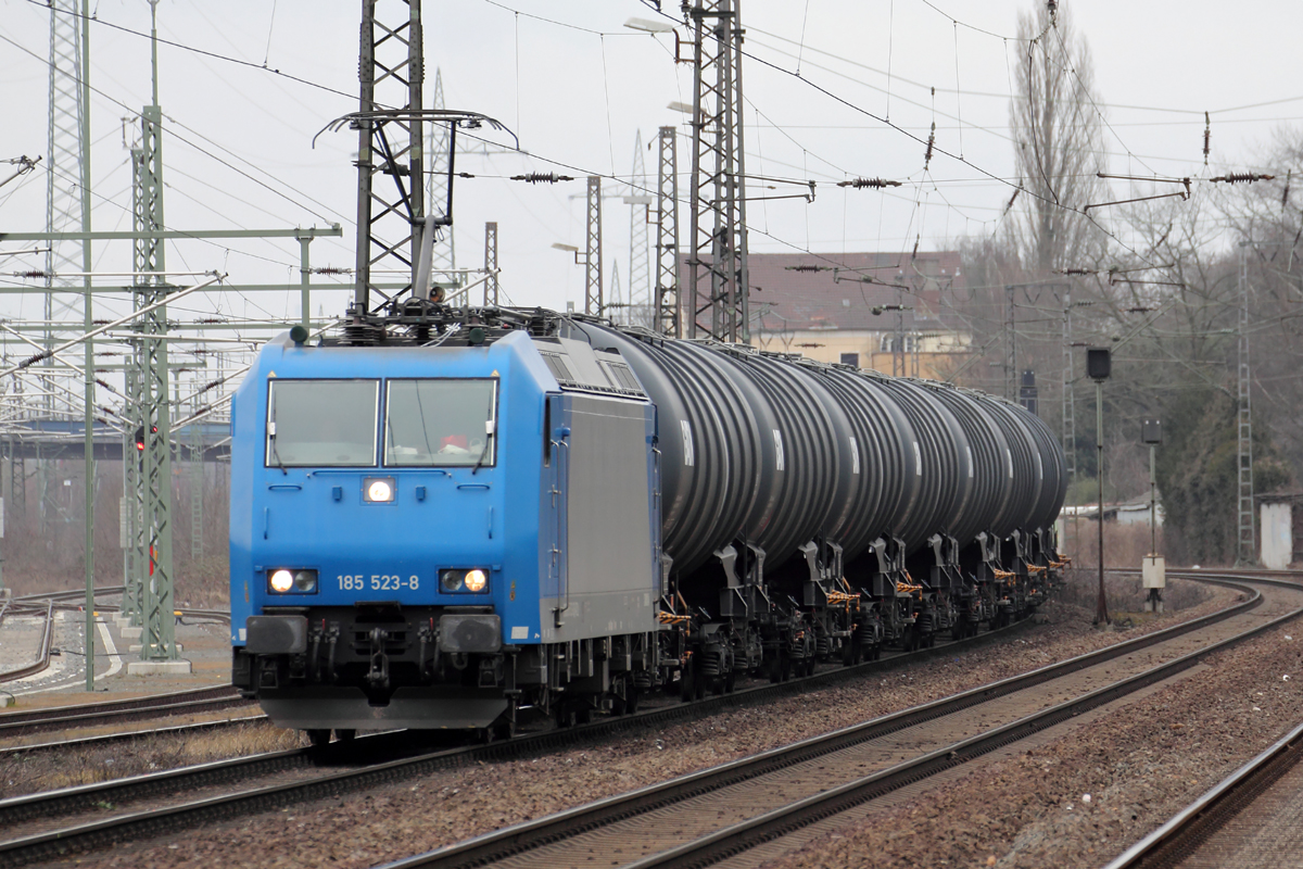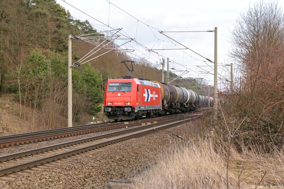 185 632-7 Alpha Trains für RheinCargo GmbH mit einem Kesselzug "Umweltgefährdender Stoff, flüssig" in Nennhausen und fuhr weiter in Richtung Stendal. 24.03.2016 Stephan Kemnitz