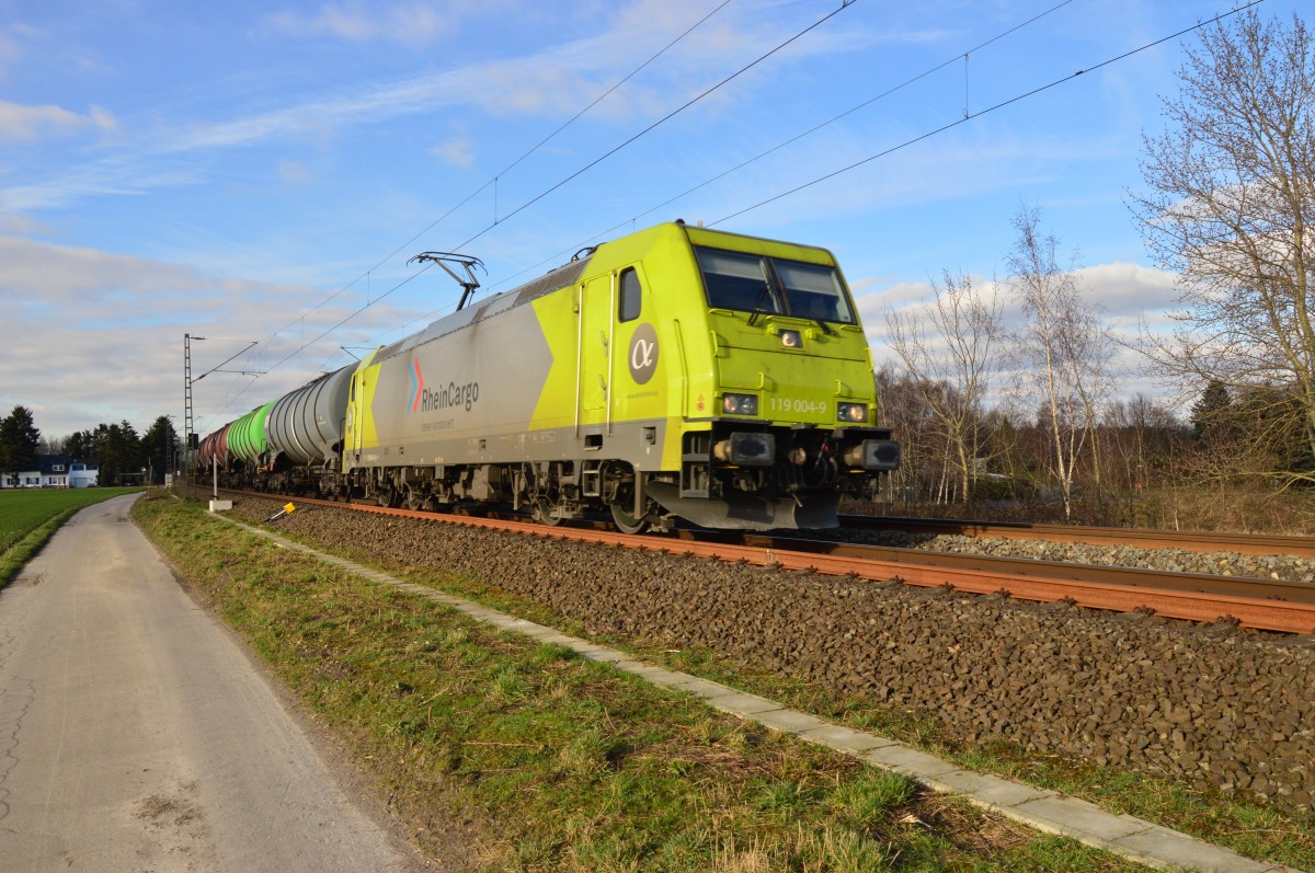 Die für RheinCargo fahrende Alfatrain 119 004-9, eine Norwegerin, kommt mir hier in Kaarst Broicherseite ins Visier, mit einem Tankwagenzug. Freitag den 12.2.2016 Andreas Strobel