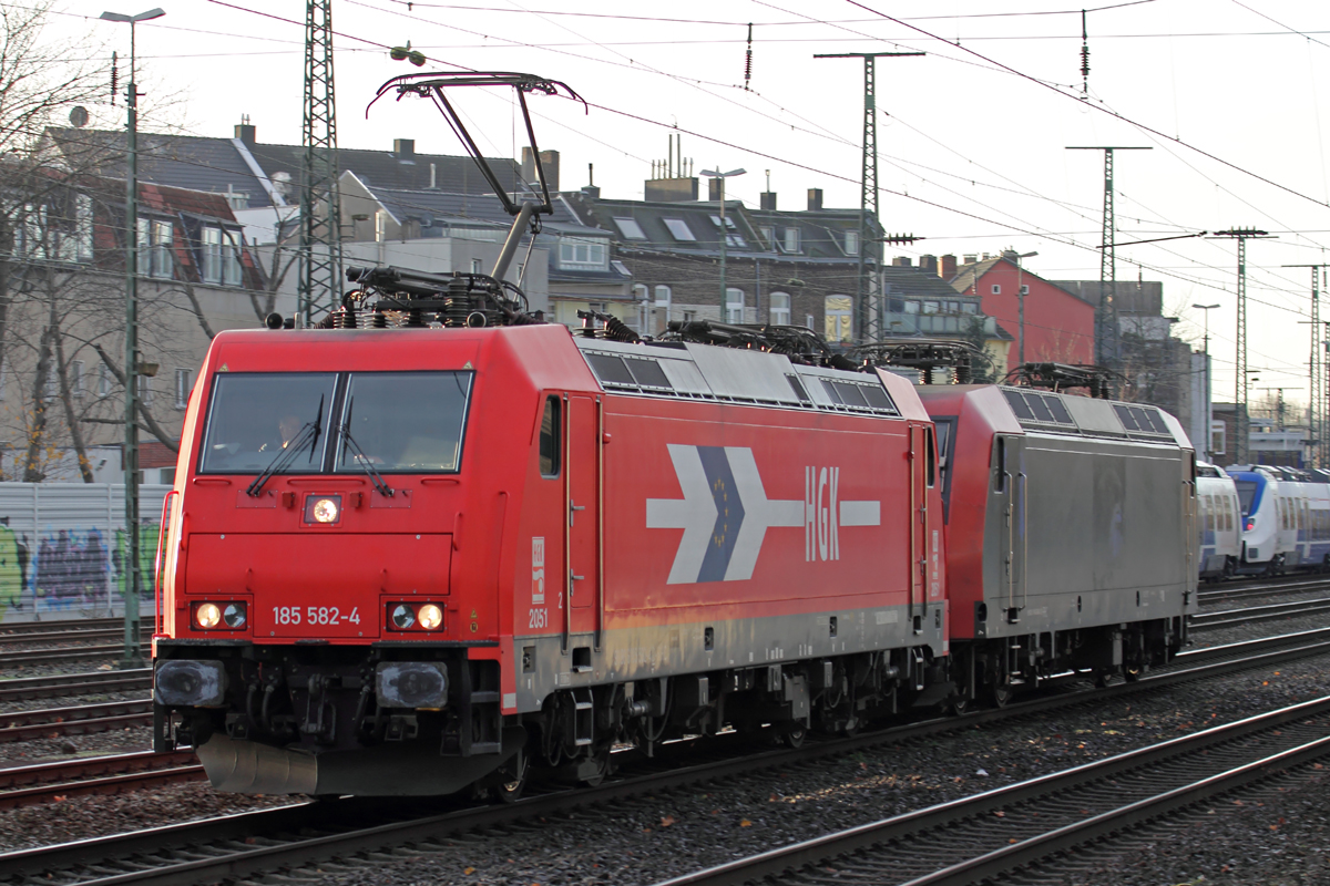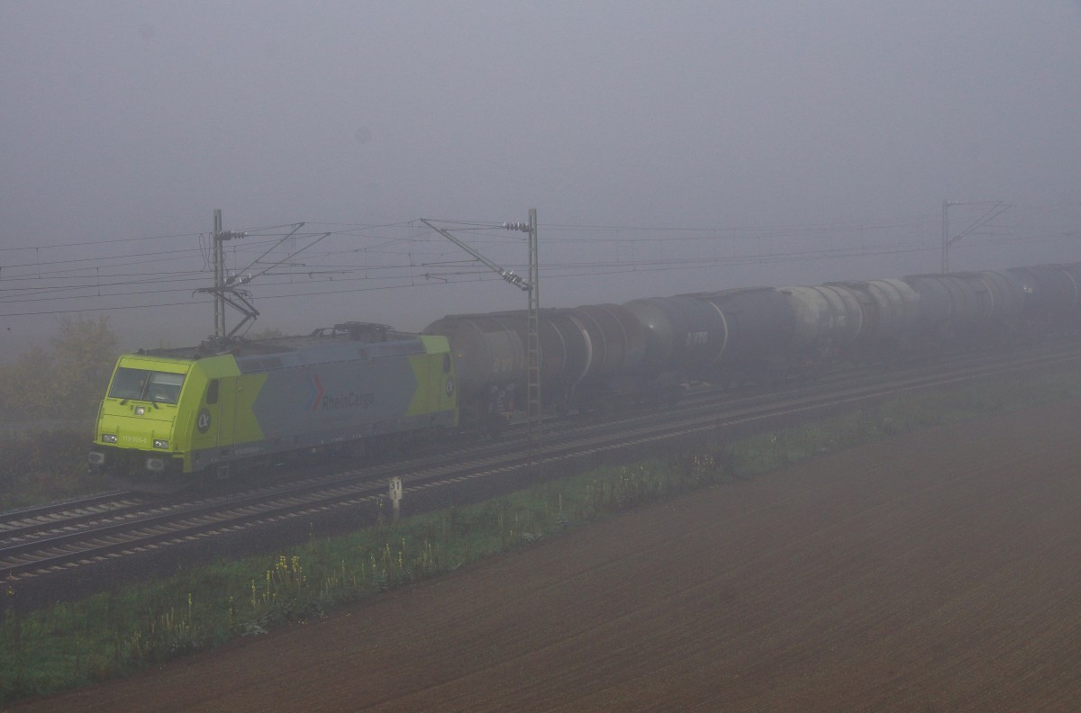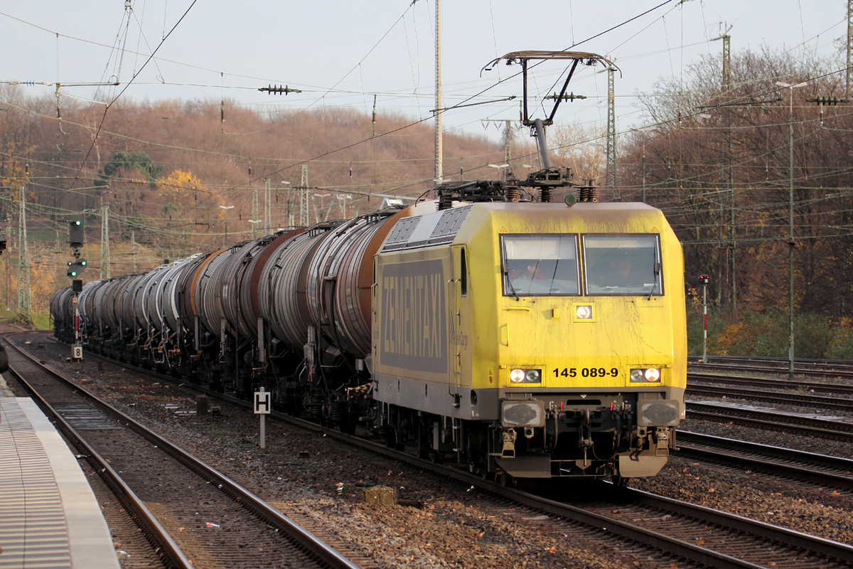 Blick von der Brücke über den Neusser Güterbahnhof auf zwei RHC-Loks....es sind die 2002 eine 145ziger und ihre Schwesterlok die 145 089, die hier mit einem Silowagenzug der Sonntagsruhe fröhnen. 22.11.2015 Andreas Strobel