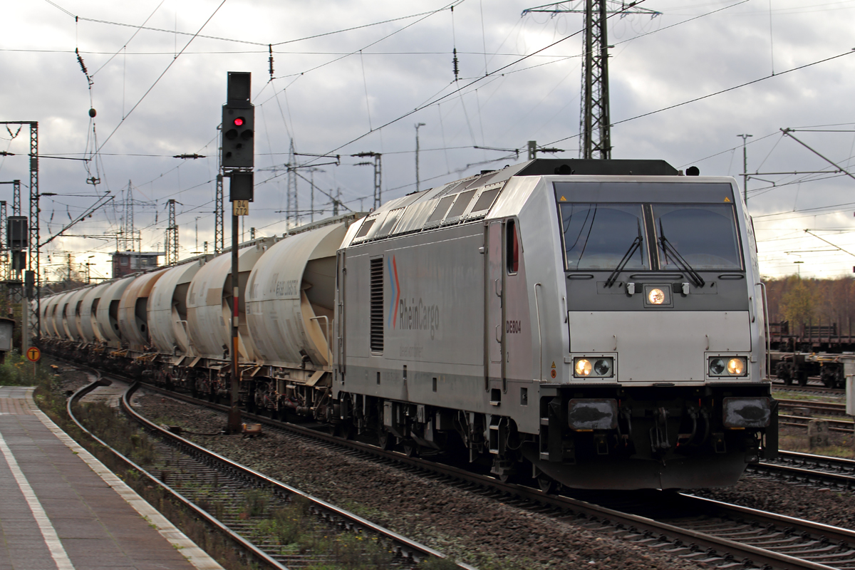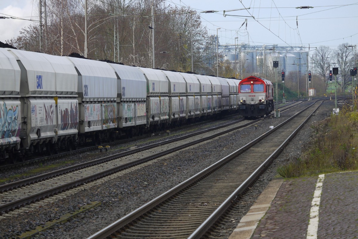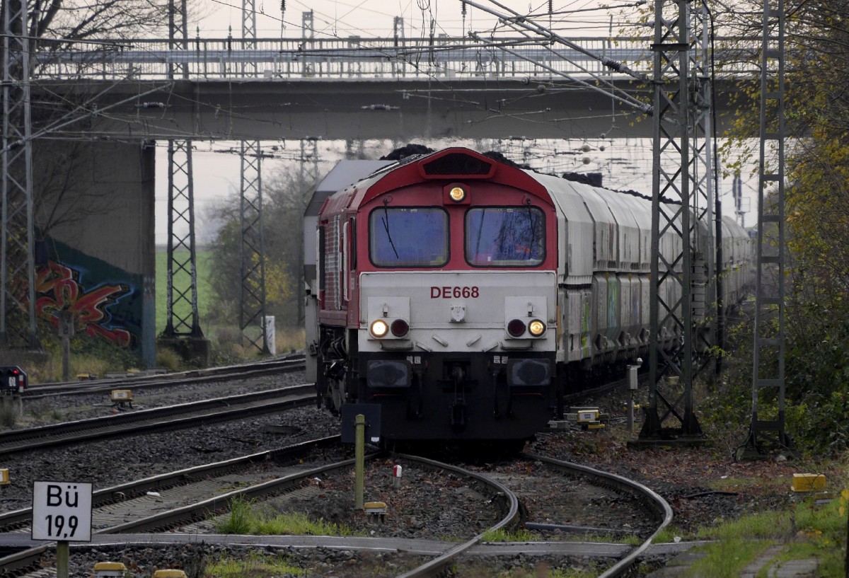 Die noch ganz im HGK-Design gehaltene RHC-Lok DE 668 (92 80 1 266 068-6 D-RHC) fährt mit einem langen Kohlenstaub-Zug von den Kraftwerken in Niederaußem in Rommerskirchen ein (5.12.15). Hermann-Josef Weirich