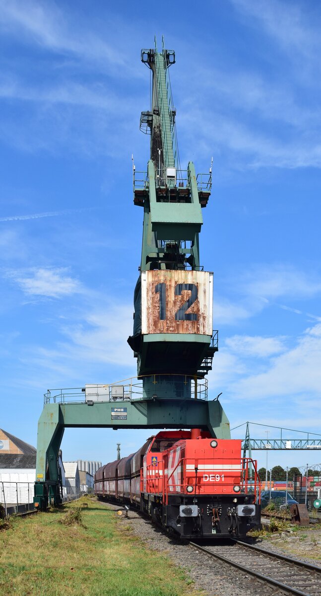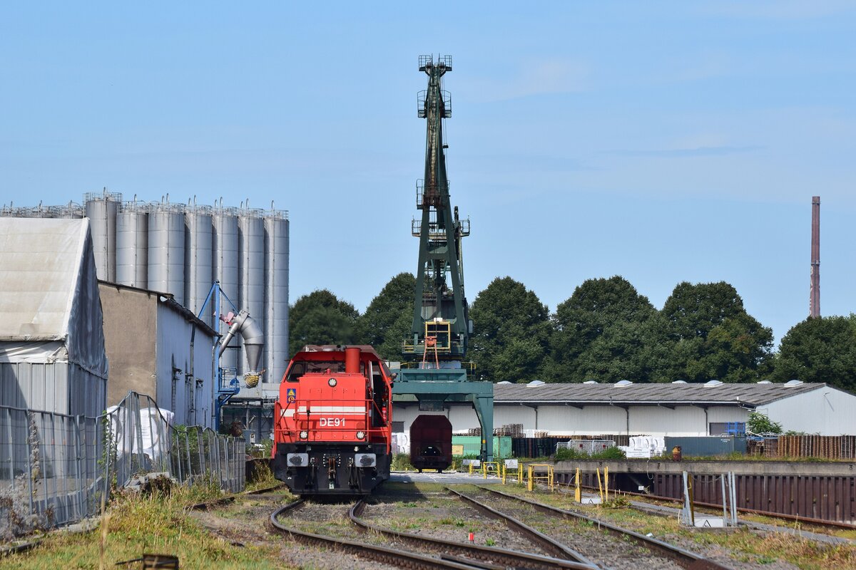 DE91 drückt einige Schüttgutwagen für Feuchthydrath in die Ladegleise des Hafenbecken 1.