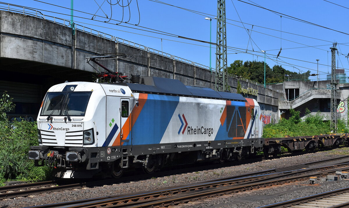 RheinCargo GmbH & Co. KG, Neuss [D] mit der northrail Vectron Dual Lok  248 015  [NVR-Nummer: 90 80 2248 015-0 D-NRAIL] verlässt mit einem Ganzzug Containertragwagen (leer) den Hamburger Hafen am 30.07.24 Höhe Bahnhof Hamburg Harburg.