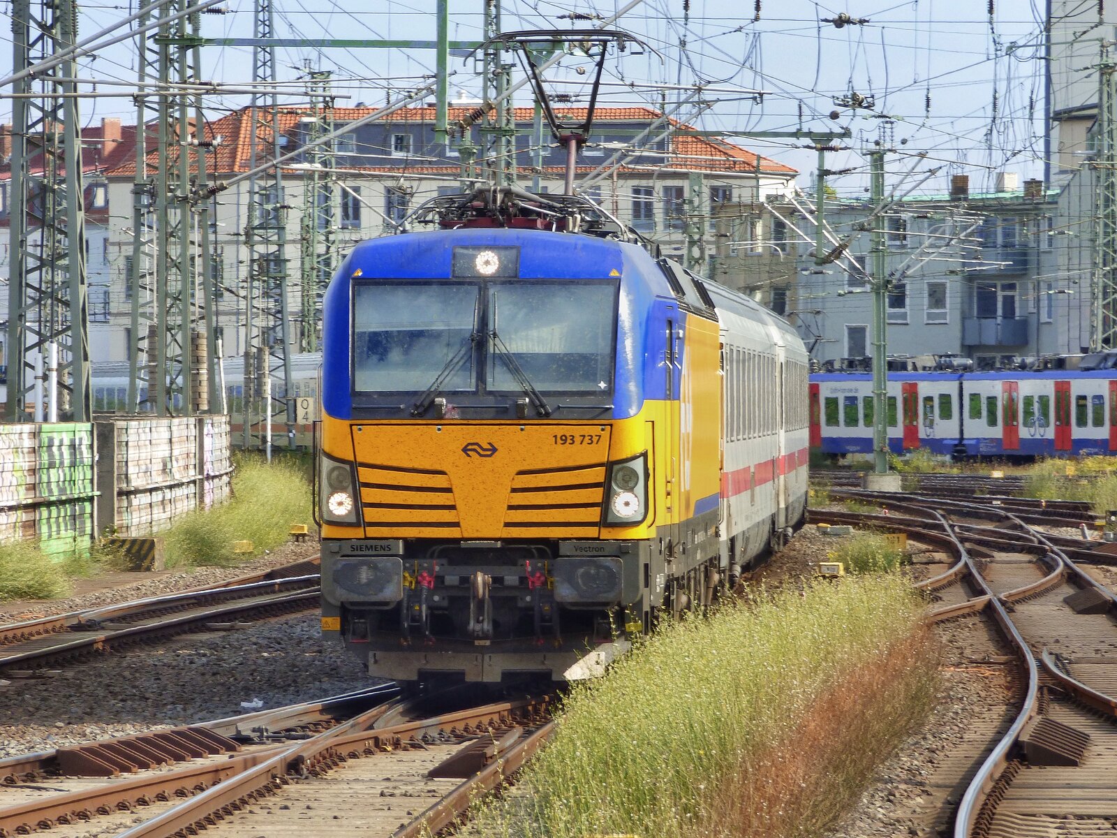 193 737 fährt mit einem IC von Berlin nach Amsterdam durch Minden. Seit der Umstellung auf Vectron Loks und einer Fahrzeitverkürzung hält der Zug nicht mehr in Minden, um zwischen S-Bahn und RE6 durchzukommen. April 2025 Bern hard
