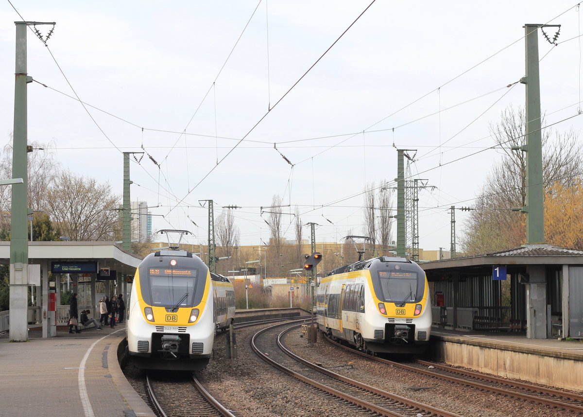 Hamster-/RE19-Treffen am 29.02.2020 im Bahnhof Waiblingen: 3442 707 Stuttgart-Hessental fährt auf Gleis 3 ein, während 3442 700 Hessental-Stuttgart den Bahnhof auf Gleis 1 verlässt.