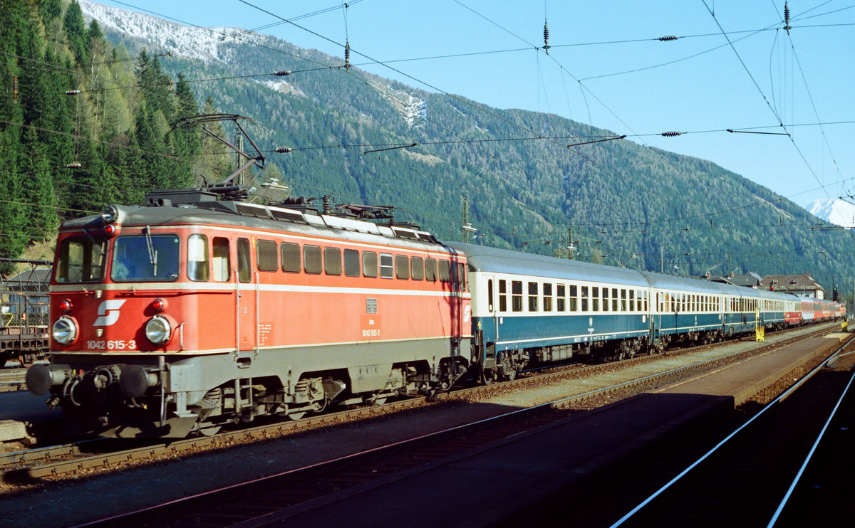 05.Mai 1990: Im Bahnhof Mallnitz warteten wir auf „unseren“ Zug durch die Tauernschleuse. Lok ÖBB 1044 063 mit einem Zug nach Süden und ÖBB 1042 630 stehen im Bahnhof. Jürgen Krause