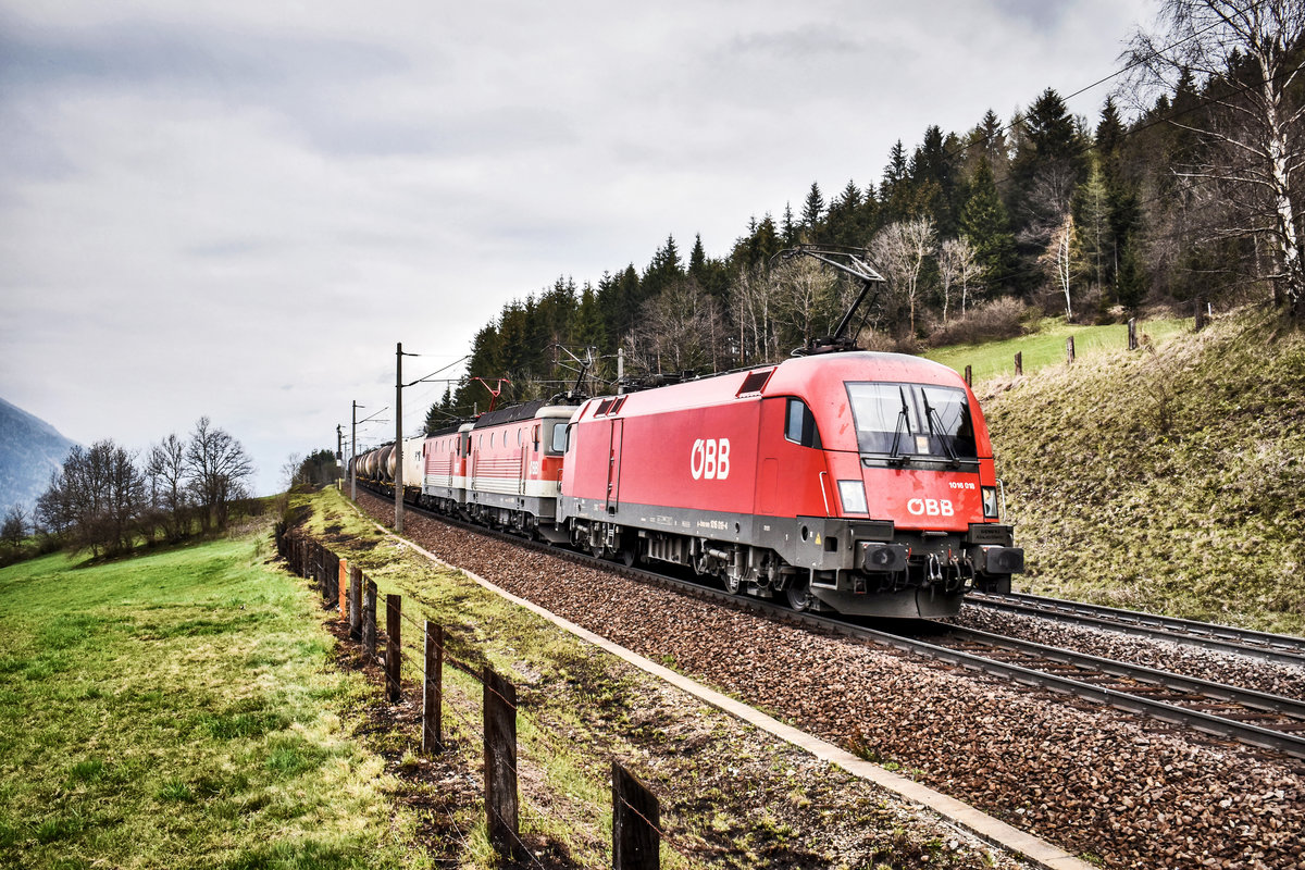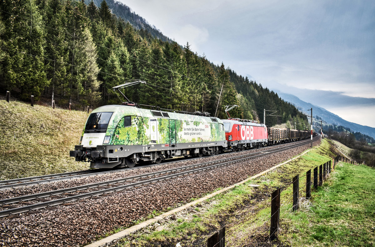 1016 023-4 "Green Points" und 1293 023-8 fahren mit einem gemischten Güterzug, bei Penk, die Tauernbahn-Südrampe hinauf.
