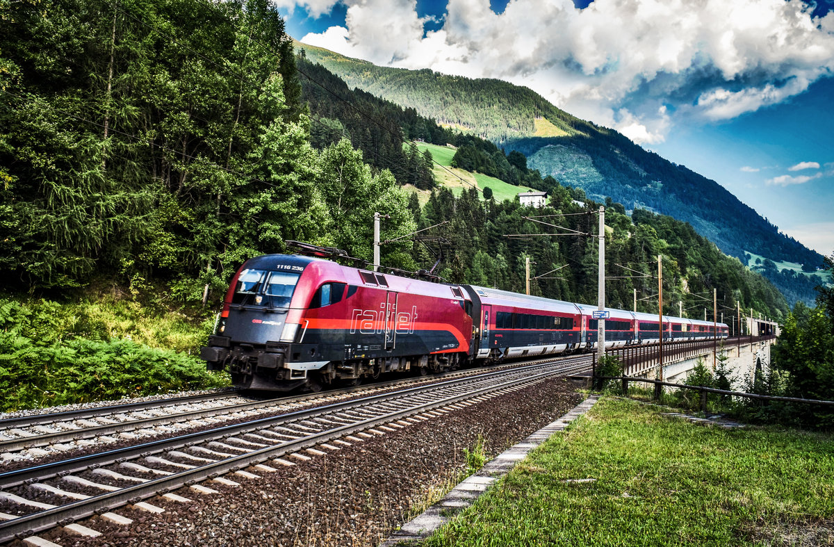 1116 236-1 überquert mit dem railjet 110 "Hohe Tauern" (Klagenfurt Hbf - München Hbf), die Falkenstein-Brücke, kurz vor der Haltestelle Oberfalkenstein.