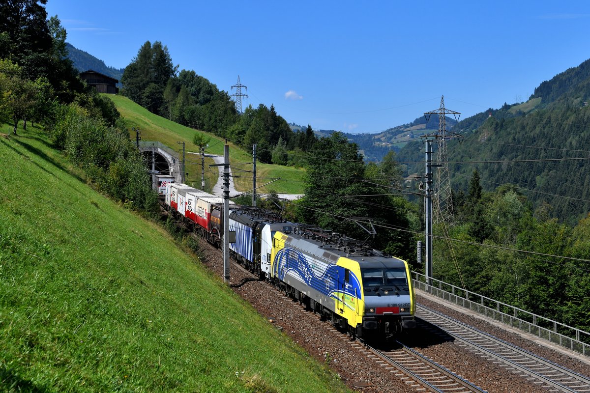 Am 09. August 2018 konnte ich die 189 912 und 193 770 von Lokomotion mit einem aufgrund der Brennersperre umgeleiteten KLV bei Oberuntersberg in der Nähe des Bahnhofs Loifarn an der Tauernbahn aufnehmen. Hier sieht man den Zug beim Verlassen des Kenlach-Tunnels, die Strecke wurde in diesem Bereich vor einigen Jahren komplett neu trassiert. Christoph Schneider