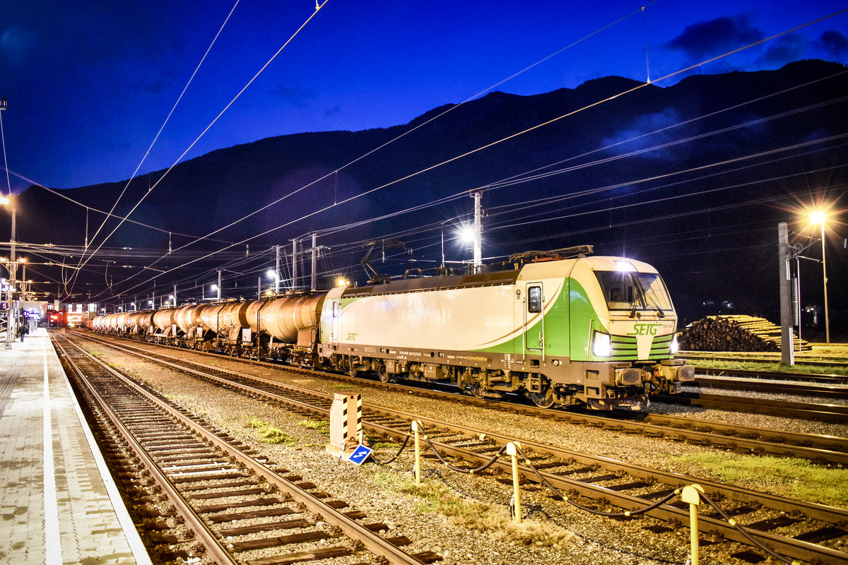 ELL 193 240-9 der SETG, wartet mit ihrem Kesselwagenzug in Richtung Deutschland, im Bahnhof Spittal-Millstättersee auf die Weiterfahrt.