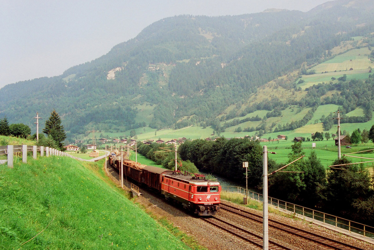September 1989, im Salzachtal bei Gollling, Güterzug der ÖBB mit Lok 1043 002. Das ist eine der 10 schwedischen thyristorgesteuerten Maschinen. die ab 1971 bei der ÖBB eingesetzt wurden. Jürgen Krause
