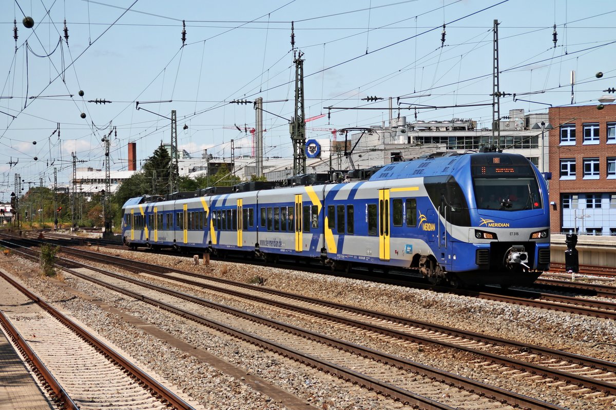 Durchfahrt am 25.08.2015 von Meridian ET 316 (1430 016-4/1430 516-3) als M (München Hbf - Kufstein) in München Heimeranplatz in Richtung Ostbahnhof. Tobias Schmidt