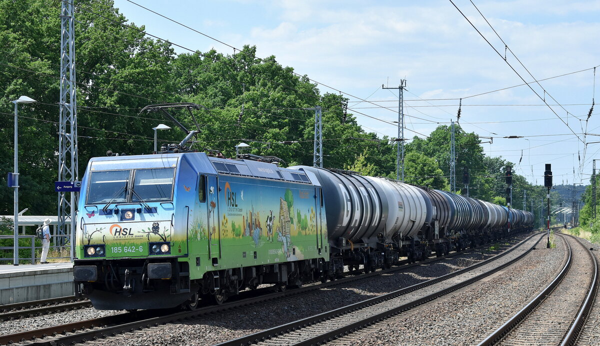 HSL Logistik GmbH, Hamburg [D] mit ihrer "185 642-6" [NVR-Nummer: 91 80 6185 642-6 D-HSL] und einem Kesselwagenzug am 12.06.23 Höhe Bahnhof Saarmund. Lothar Stöckmann