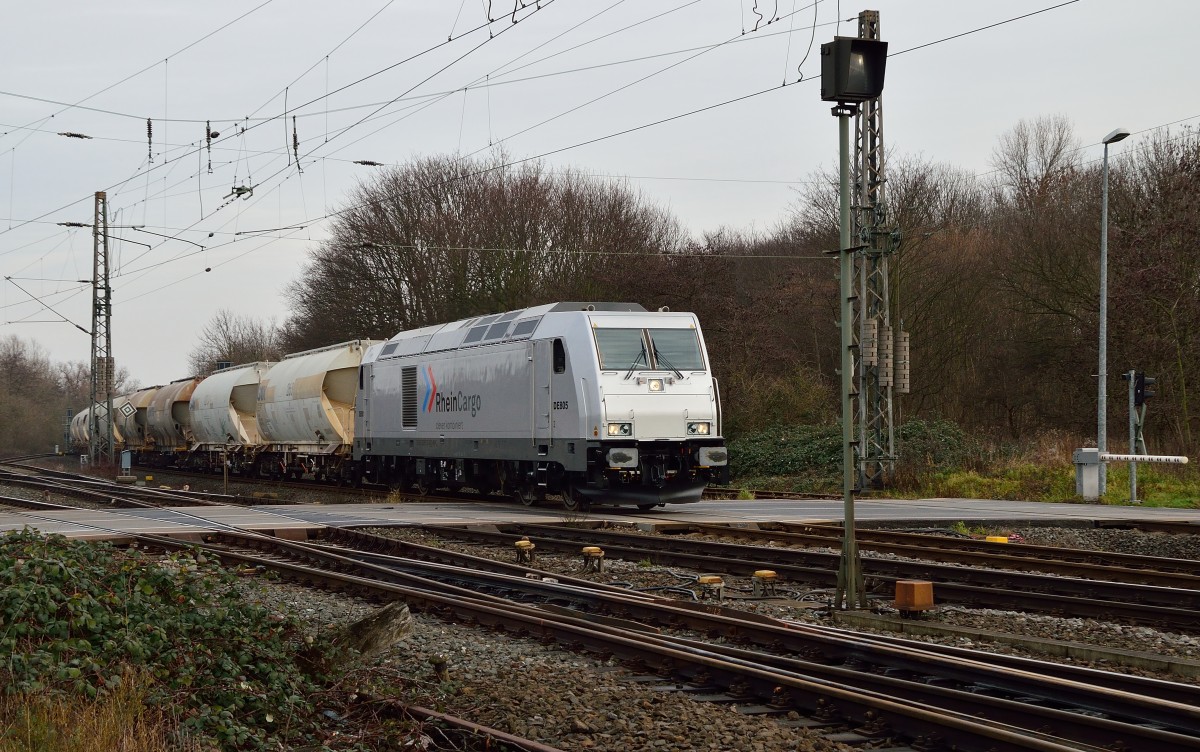 Gegenlichtaufnahme der RheinCargo DE 805/285 116-0, die hier mit einem Leerzug aus Kalksilowagen durch Grevenbroich wohl in Richtung Flandersbach unterwegs sein dürfte. 25.1.2014 Andreas Strobel