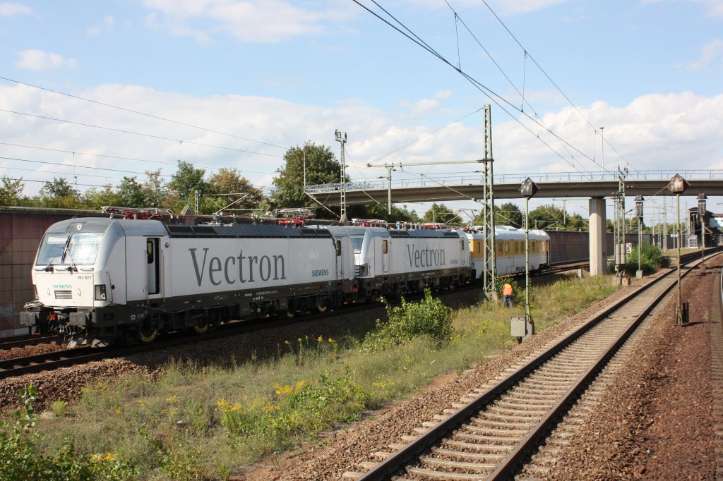 Siemens Vectron 193 921-4 hängt an 120 206-8 am 16.05.2012 im Bw am Aachener Hbf. Das Foto wurde durch den Zaun an der Kamperstrasse gemacht. Mario Schürholz