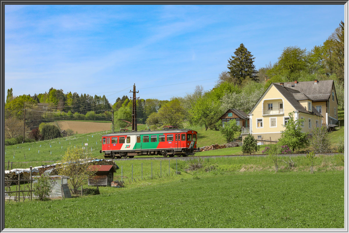 Mit einer Maximalsteigung von 42 ‰ geht es von Feldbach durch das Steirisches Vulkanland nach Bad Gleichenberg. ET 2 am 22.4.2019 aufgenommen zwischen den Haltestellen Oedt bei Feldbach und Prädiberg. Hanspeter Reschinger