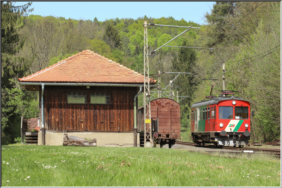 Umgeben von ländlichem Idyll , zirpenden Grillen , alles was sonst noch so krabbelt und dem Geruch des E-Triebwagens der Gleichenberger Bahn der doch etwas an Leistung bringen muss um die wie im Hintergrund zu erkennenden Steigungen zu bewältigen.