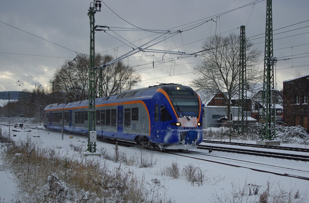 Der Cantus Flirt bei seiner Einfahrt in Richtung Eschwege Stadt sorgte am 21.12.2010 für etwas Farbe im winterlichen weiß. Aufgenommen am Bü Eltmannshausen/Oberhone. Jens Baumhauer