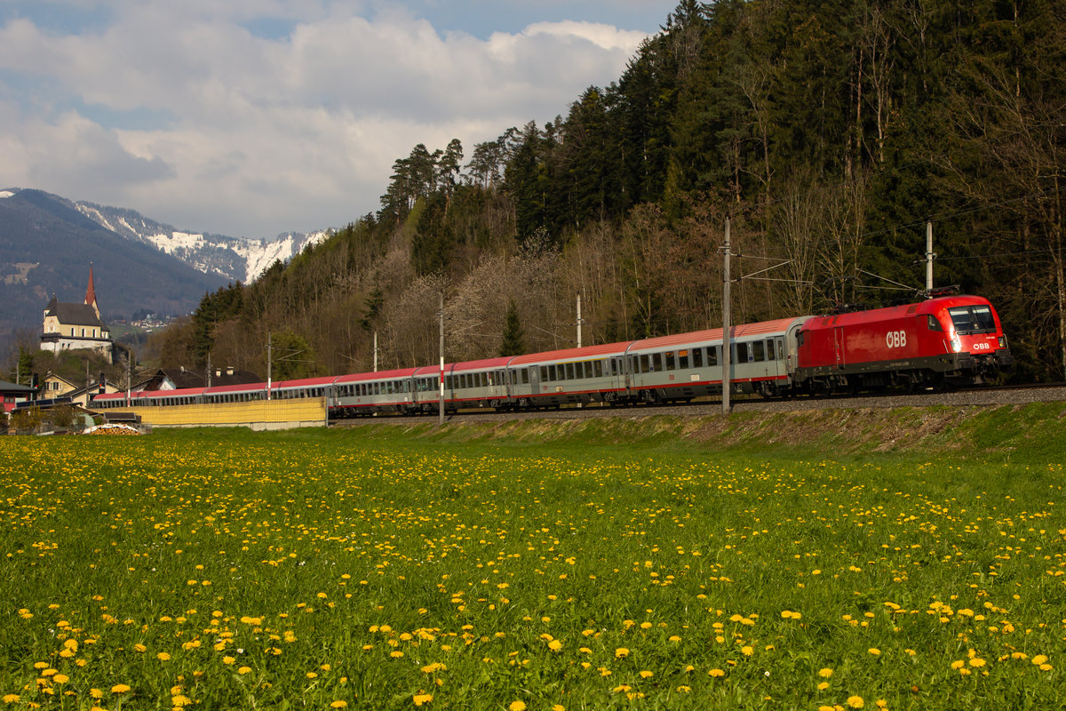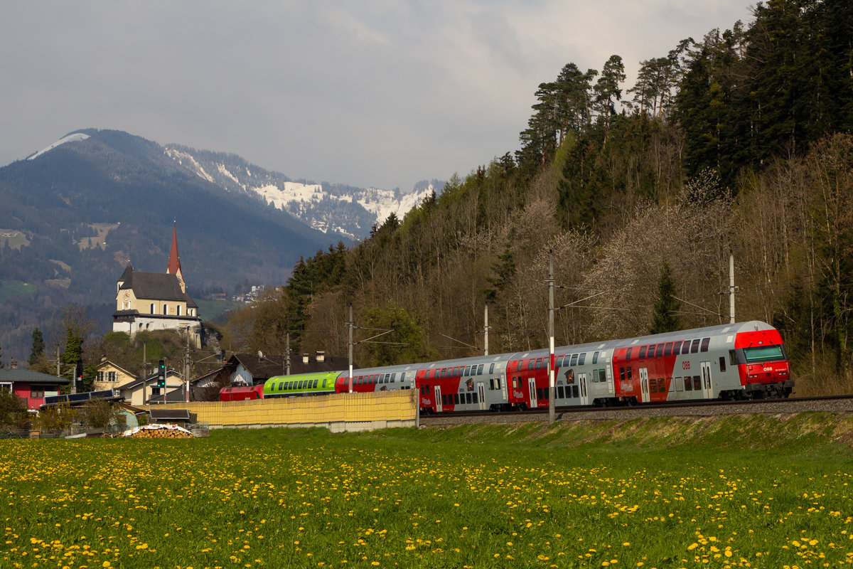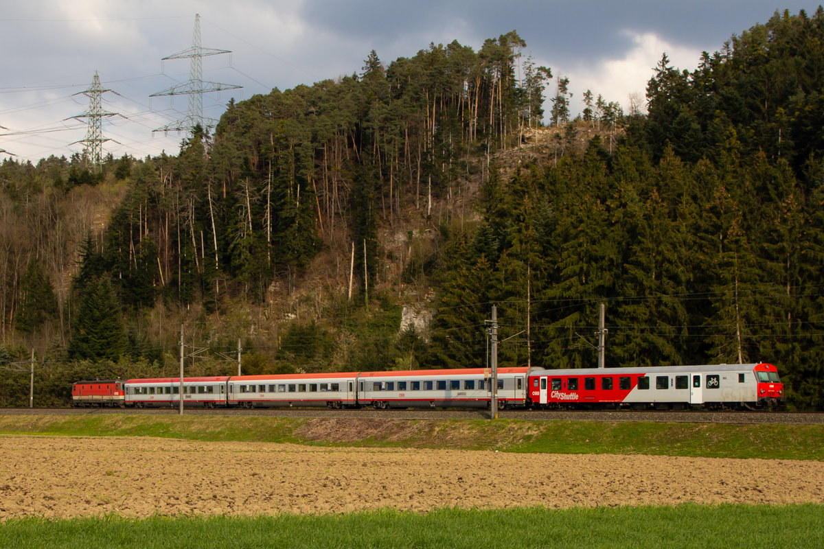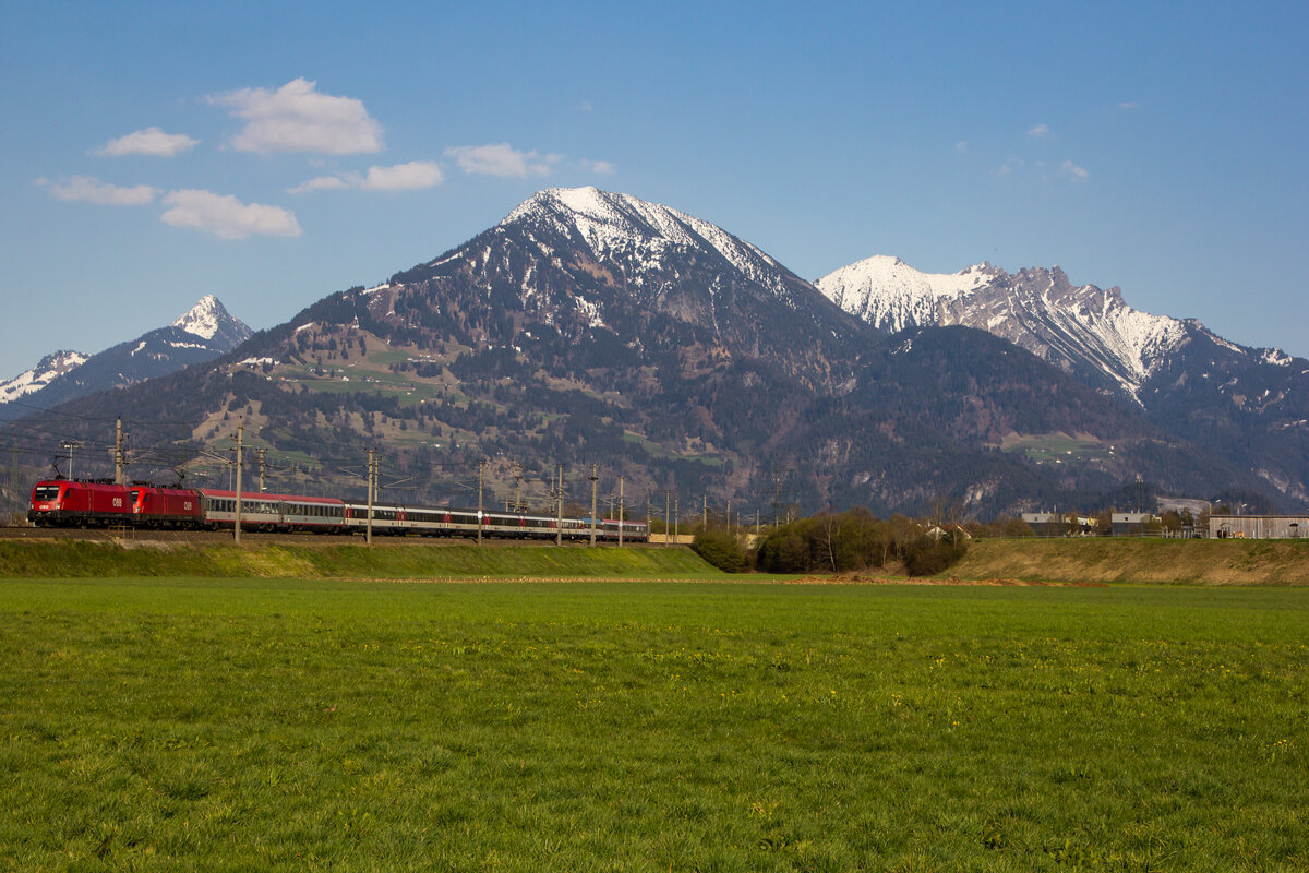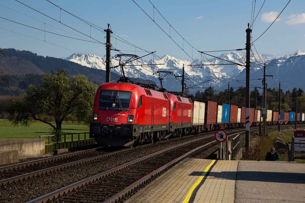 EuroCity EC 197 derzeit auf Umleitung von Feldkirch nach Bregenz aufgrund von Bauarbeiten in Lauterach/Hard. Rabe 503 013, 9.4.21 bei Schwarzach. Marvin Schenk