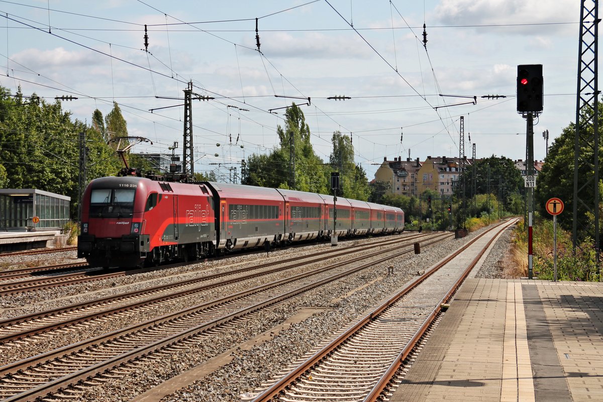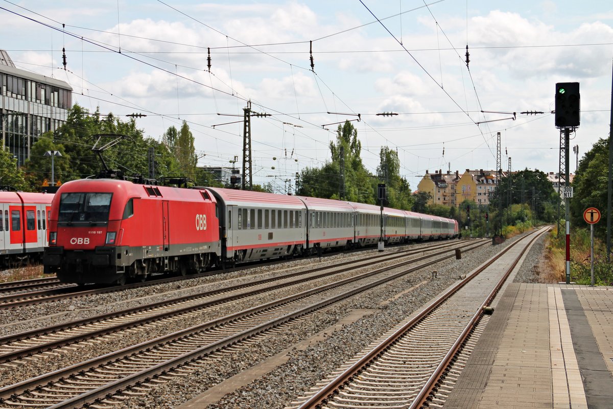 Nachschuss auf 1116 197, welche am 25.08.2015 den EC 113 (Frankfurt (Main) Hbf - Klagenfurt Hbf) zusammen 1016 045 bespannte und durch München Heimeranplatz gen Ostbahnhof schiebte. Tobias Schmidt