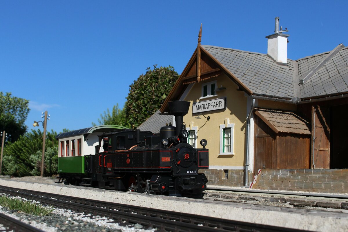 Die U43 der Wildbacher Lokalbahn fuhr 1990 als Aushilfe eine Zeit lang auf der Lokalbahn von Brunn am Berg nach Fassl und wartet in Mariapfarr mit dem sonntäglichen Regionalzug auf die Abfahrt.