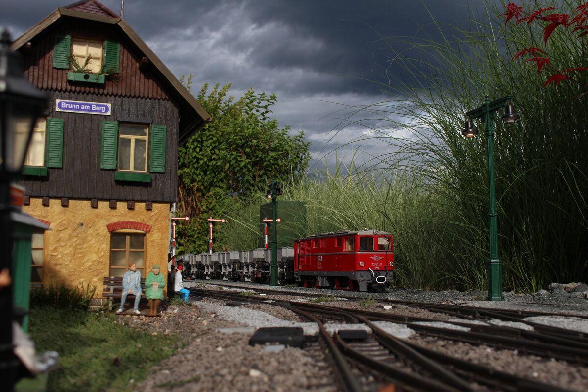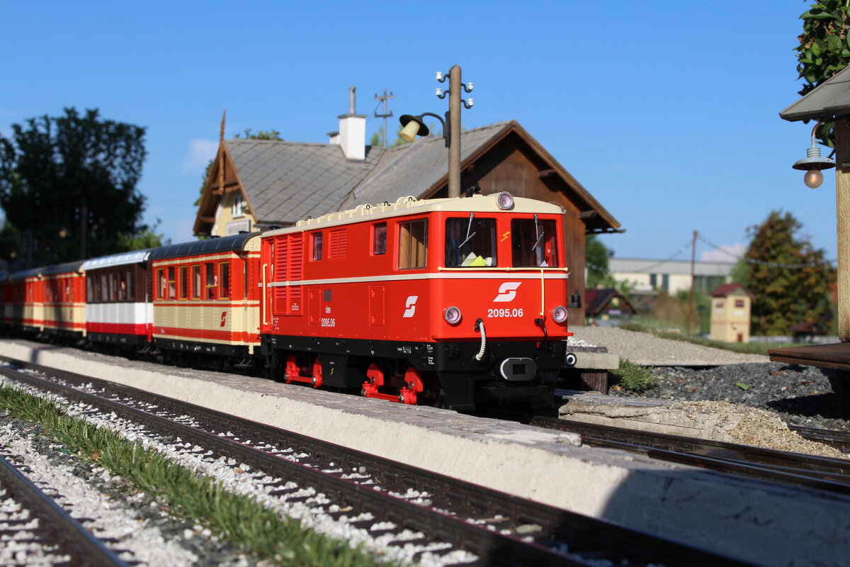 Während die 2095 004 mit einem Schotterzug in Brunn am Berg auf die Abfahrt wartet beschleunigt die Nostalgielok 2095.05 mit ihrem Regionalzug aus dem Bahnhof in Richtung Garting.