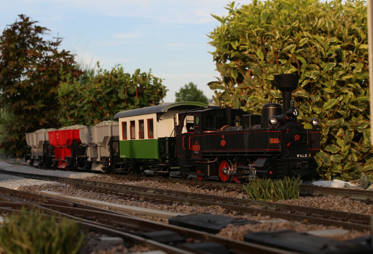 Nachdem die U43 der Wildbacher Lokalbahn mit einem Dienstpersonenwagen in Wildbach Steinbruch angekommen ist wird im letzten Abendlicht eines heißen Augusttages 1975 ein beladener Schotterzug zusammengestellt und anschließend nach Frauental-Bad Gams gebracht.