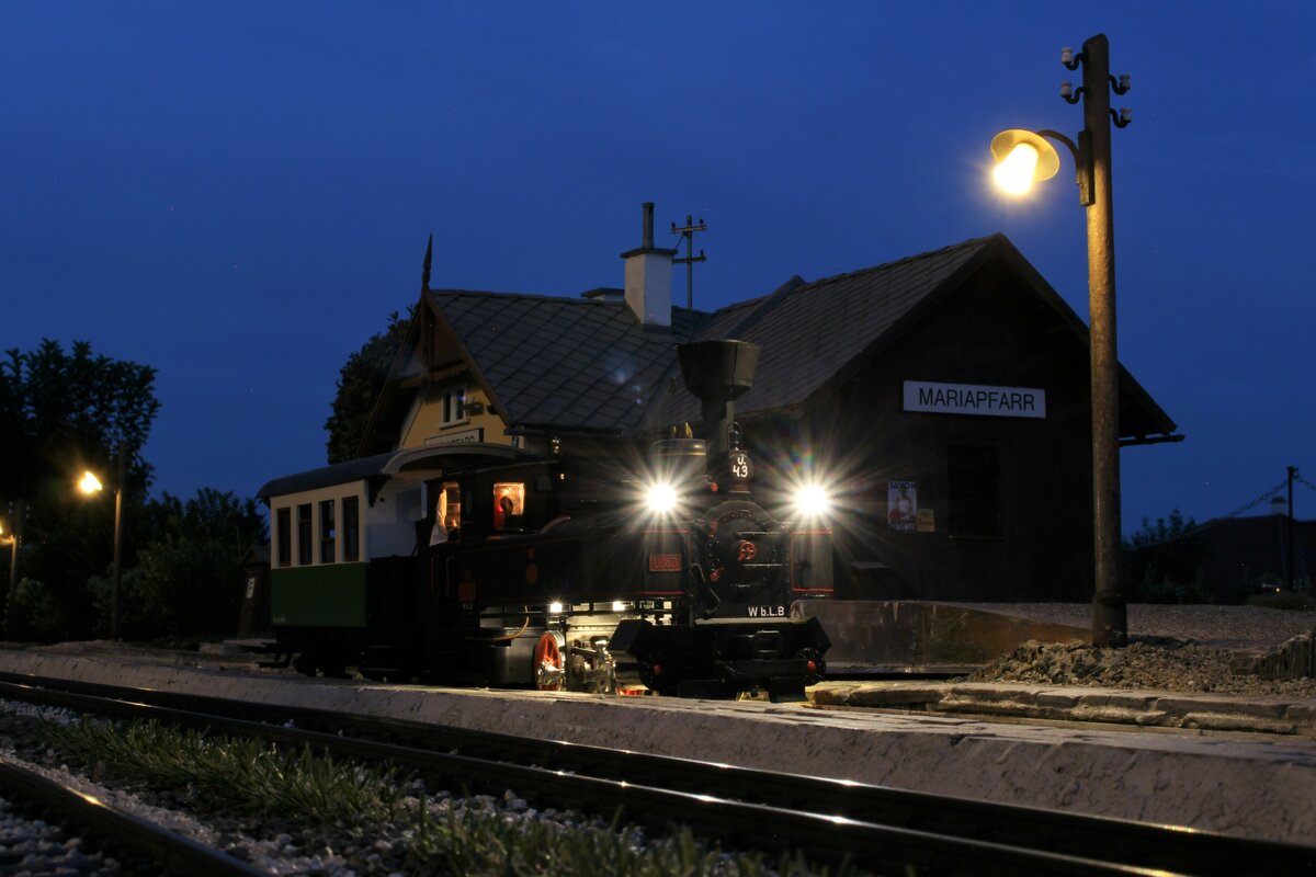 Zur blauen Stunde am Abend eines warmen Sonntages 1990 wartet die U43 der Wildbacher Lokalbahn in Mariapfarr auf die letzte Abfahrt nach Fassl.