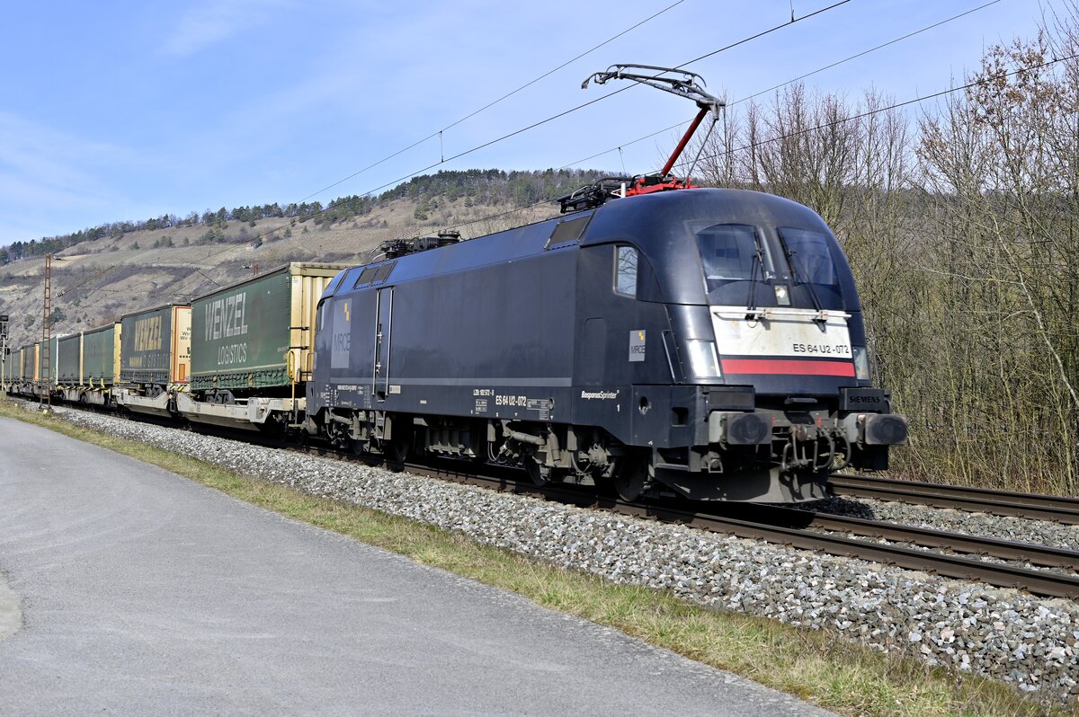 Als die ELL 193 203 von TLX mit einem Auto Walter Klv durch Thüngersheim gen Würzburg gefahren kommt am 1.3.2022 Andreas Strobel