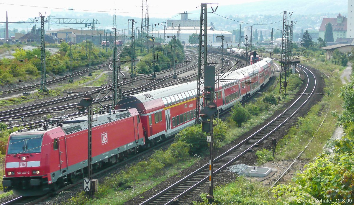 Blick von der Brücke der Rothofstraße nach Süden auf den Personenbahnhof Würzburg-Zell: 146 247 fuhr am 12.8.09 mit einem RE nach Frankfurt (M) ohne Halt durch. Jörg Schäfer