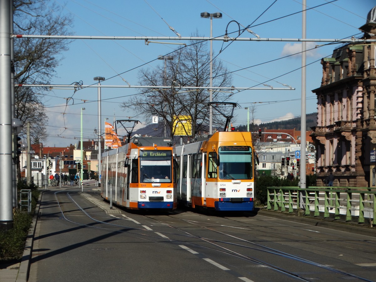 RNV MGT6D 3269 und Düwag M8C (modernisiert) 3254 am 25.02.16 in Heidelberg Wendeanlage Bismarckplatz