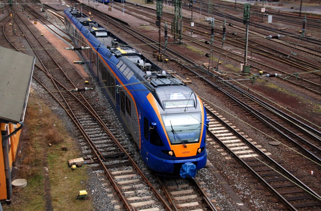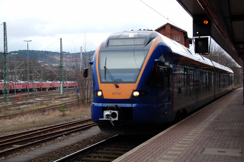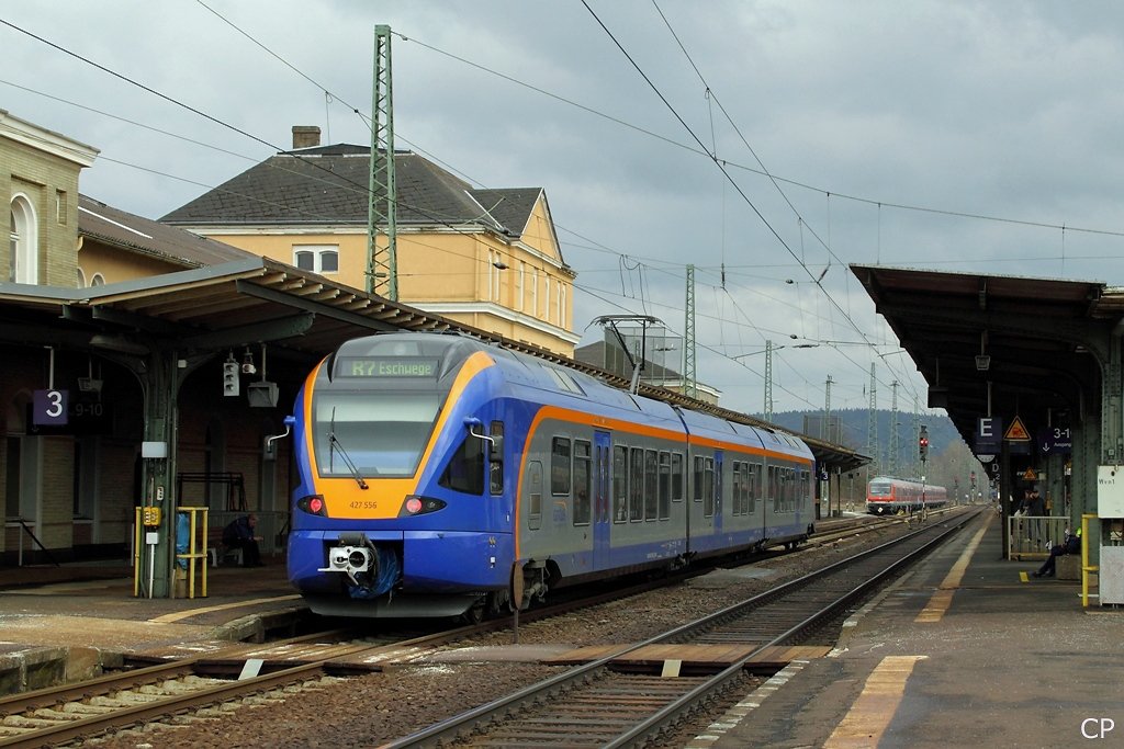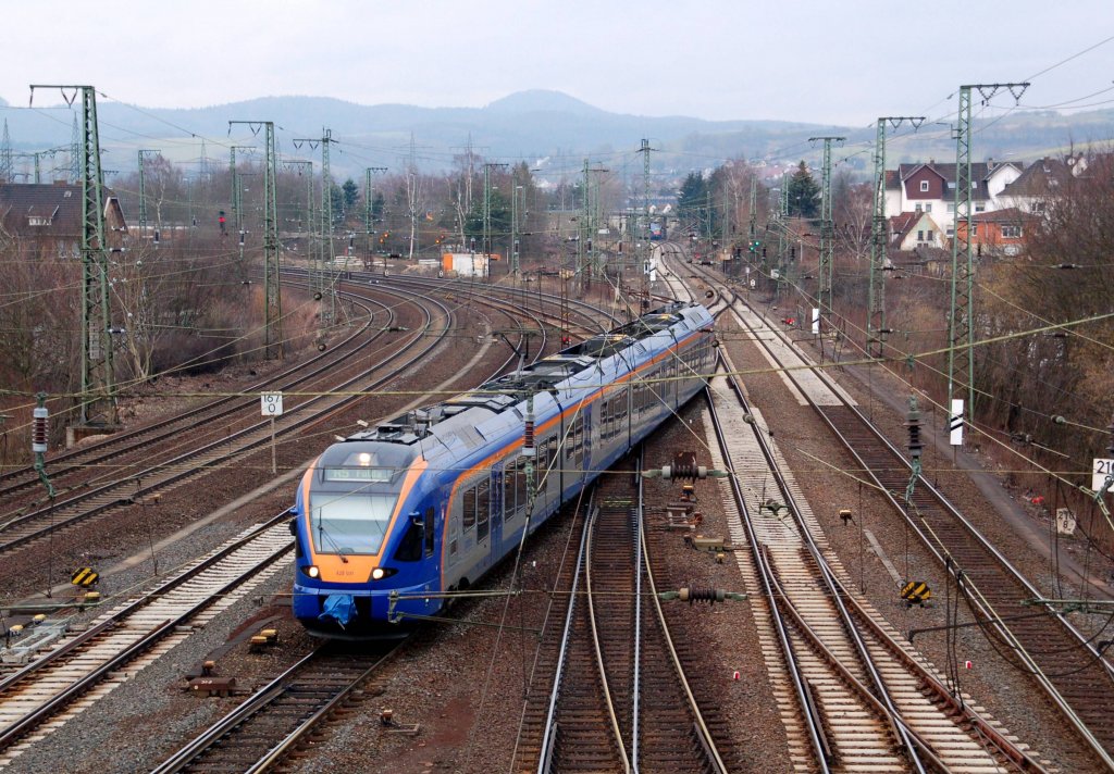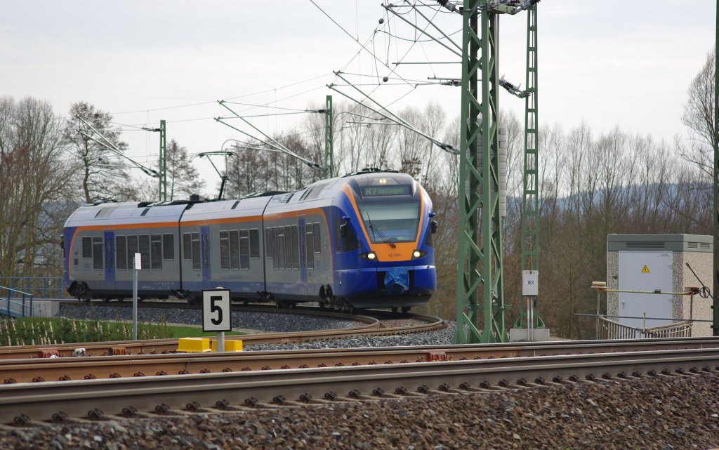 427 004 der Cantus fährt als R7 nach Göttingen gerade aus der neuen Nordschleife, die zum neuen Stadtbahnhof führt, auf die Hauptstrecke. Aufgenommen am 26.03.2010. Jens Baumhauer