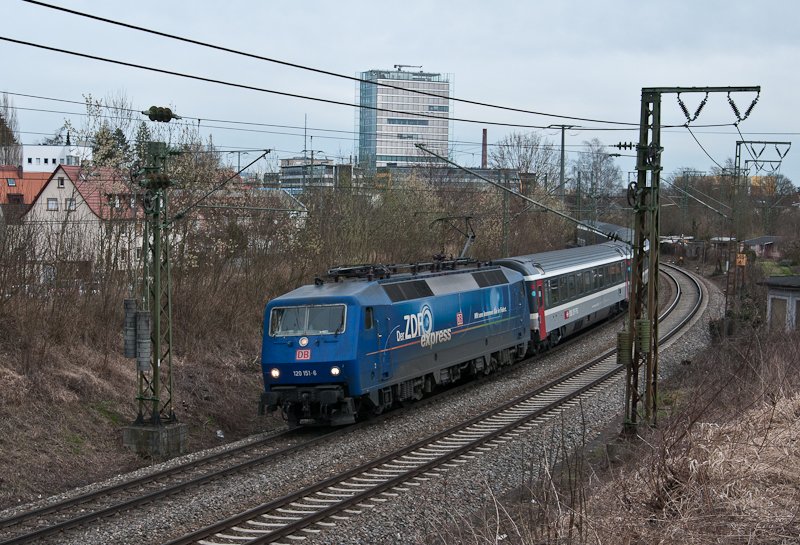 120 154-0 mit dem IC 486 (Zürich HB-Stuttgart Hbf) bei Neufra 18.3.10. Das war der letzte Zug mit dieser Nummer. Ab 21.März verkehren dann nur noch solche Garnituren mit den ICE Nummmern. Die Garnitur war auch doppelt solange wie sonst. Andreas Hackenjos