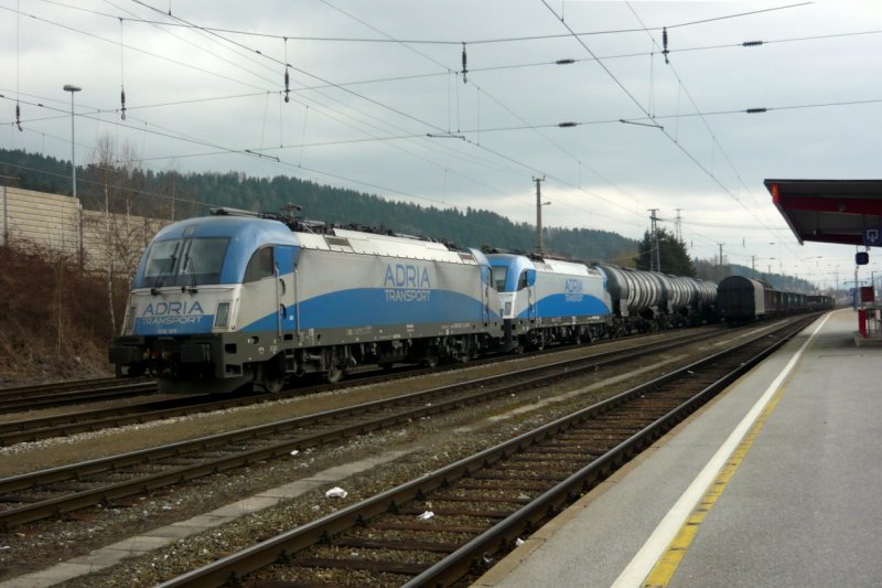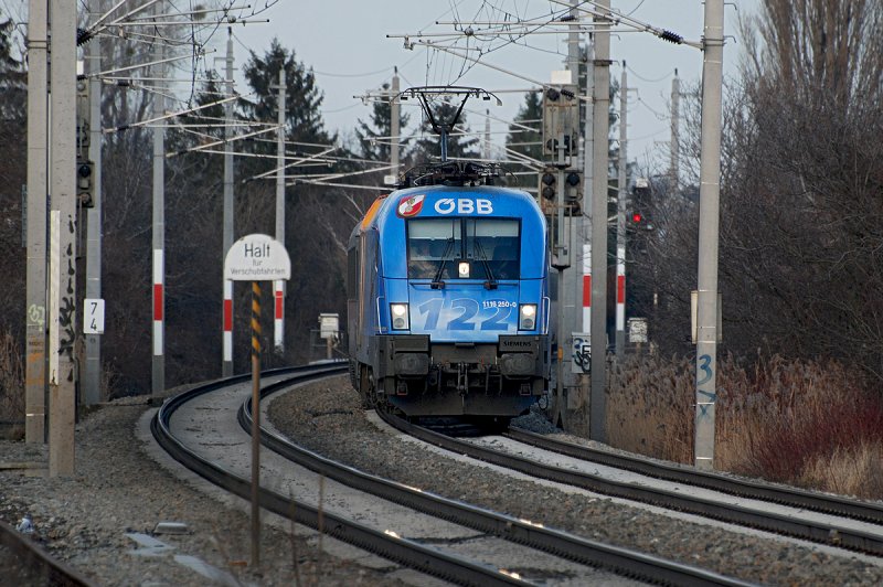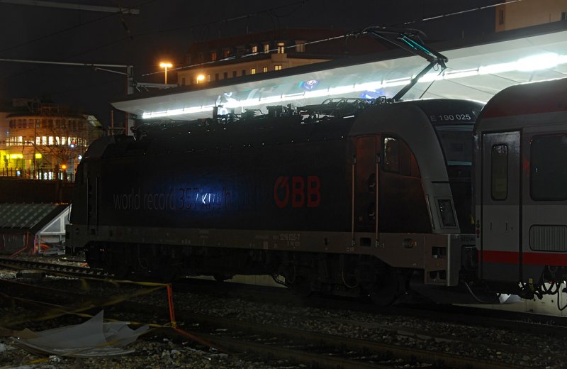 1216 025 "World Record Lok" am 26.02.2009 vor ÖBB Eurocity 539 "Lakeside Park" nach Villach beim Halt in Wien Meidling.