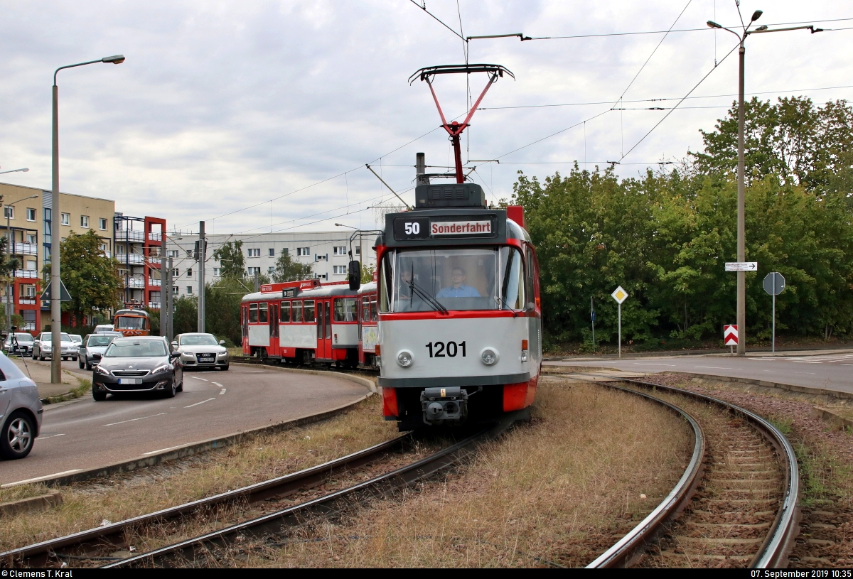 Hier befindet sich Großzug Tatra T4D-C, Wagen 1201 und 1176 sowie Beiwagen 204, der HAVAG kurz vor der Haltestelle Wiener Straße, Höhe Südstadtring/Böllberger Weg.