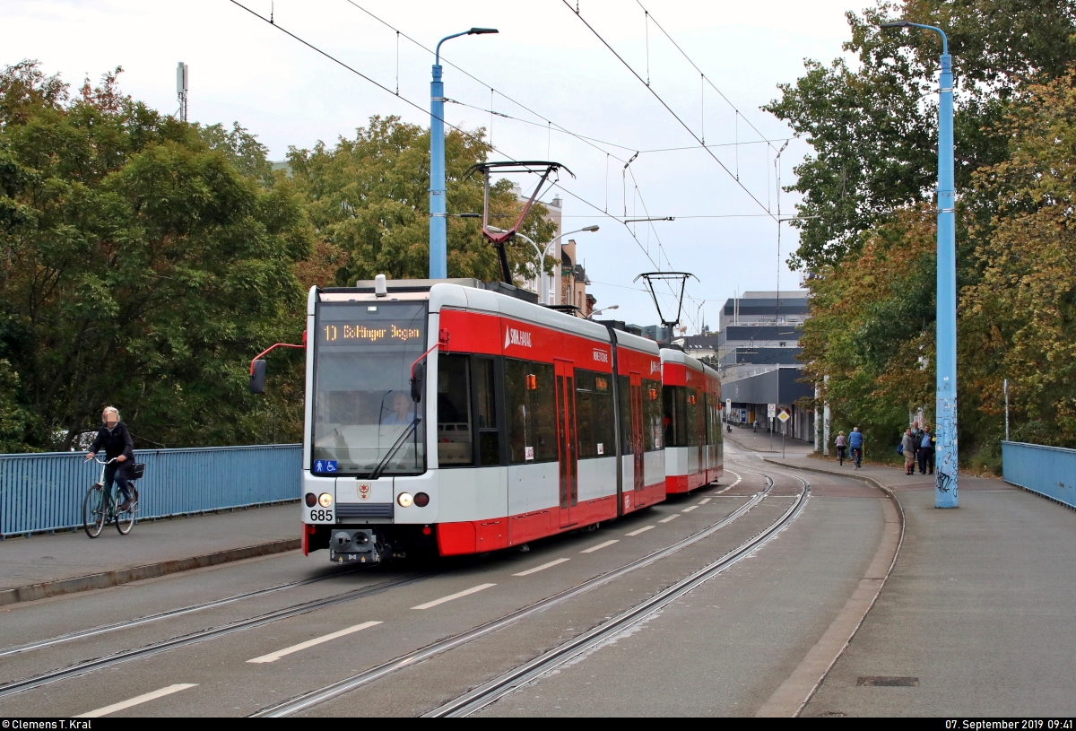 MGT-K (Bombardier Flexity Classic), Wagen 685 und 68?, der Halleschen Verkehrs-AG (HAVAG) als Linie 10 von Hauptbahnhof nach Göttinger Bogen überqueren die Elisabeth-Saale in der Mansfelder Straße.