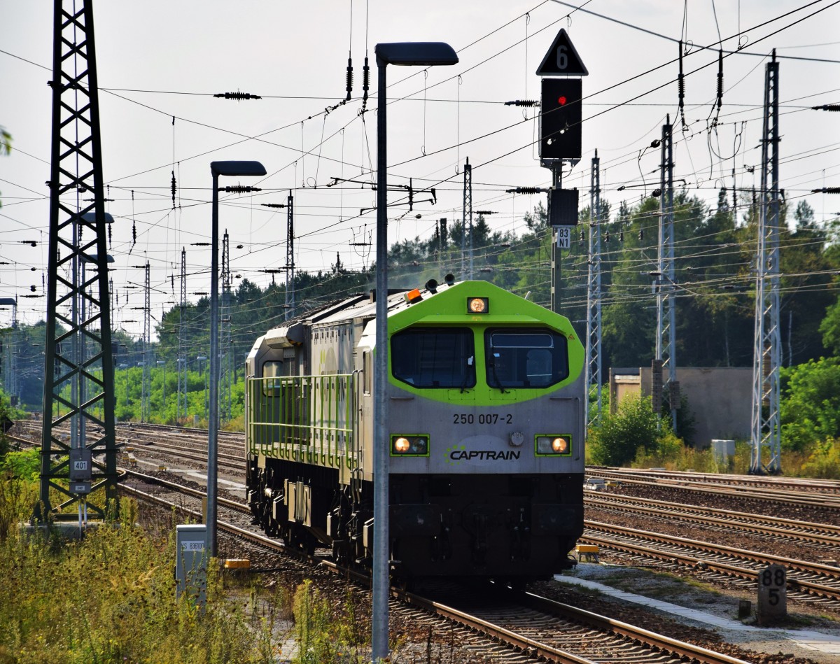 Am 2.September 2015 stand der Captrain-Tiger 250 007, in seiner sehr gewöhnungsbedürftigen Farbgebung, am ehemaligen Containerbahnhof von Neubrandenburg und ruhte sich aus, bevor es am Abend wieder in Richtung Sachsen ging. Leider ist diese Maschine gut eine Woche später, am 11. September 2015, in Berlin-Schönefeld in Flammen aufgegangen. Ob Sie je wieder fahren wird, oder doch nur als Ersatzteilspender für Ihre Schwester dienen wird, steht noch offen. Aufgenommen vom Weg neben dem Gleis in Neubrandenburg. Marius Köster