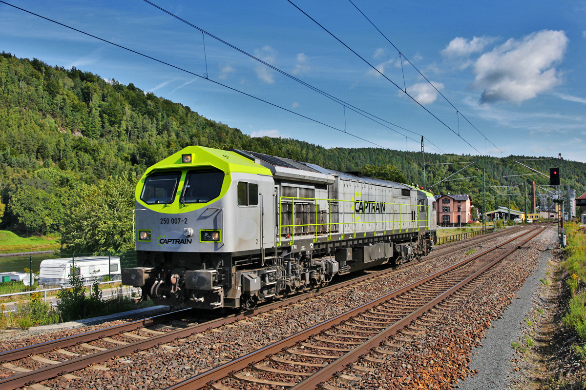 Drei Tage vor dem Brand der Captrain Diesellok 250 007-2 dieselt diese in Königsstein mit einem Getreidezug Richtung Tschechien vorüber.Bild vom 8.9.2015 Matti Morelli