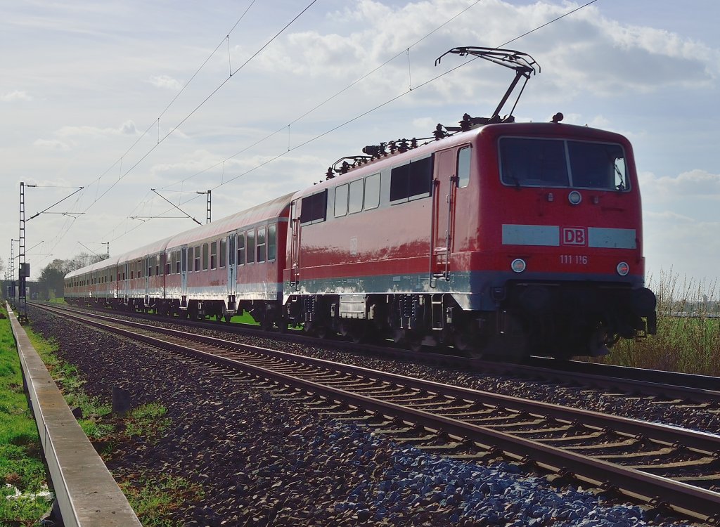 Ein RE8 Zwischentakt der bis Kaldenkirchen fährt, ist hier bei Gubberath Karlsruher voraus in Richtung Jüchen unterwegs und wird von der 111 116 geschoben. 18.4.2013 Andreas Strobel