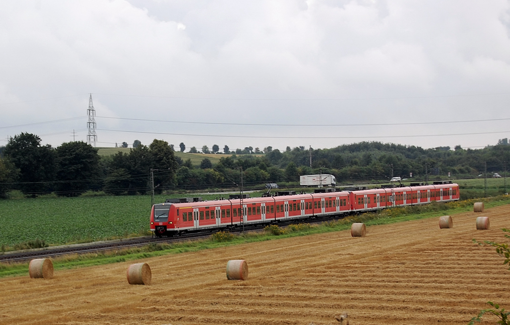 Zwei unbekannte 425er aus Mönchengladbach kommend und nach Koblenz eilende Triebwagen auf der RE8 bei Grevenbroich Noithausen. 8.8.2008 Andreas Strobel