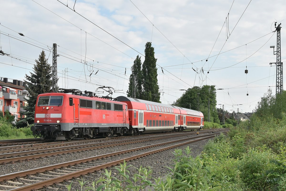 Auf Dienstfahrt ist die 111 143-4 mit zwei Dostockwagen, als sie am Freitag den 11.5.2018 durch Rheydt Hbf gen Mönchengladbach unterwegs ist. Andreas Strobel