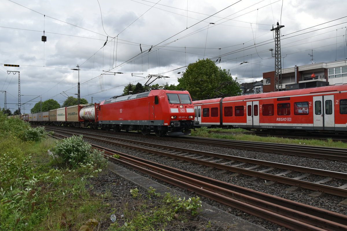 Gerade als der 425 102 als RB 27 in Rheydt einfährt, durchfährt die 185 011-4 Rheydt in Richtung Aachen West mit einem Klv. Montag den 30.4.2018 Andreas Strobel