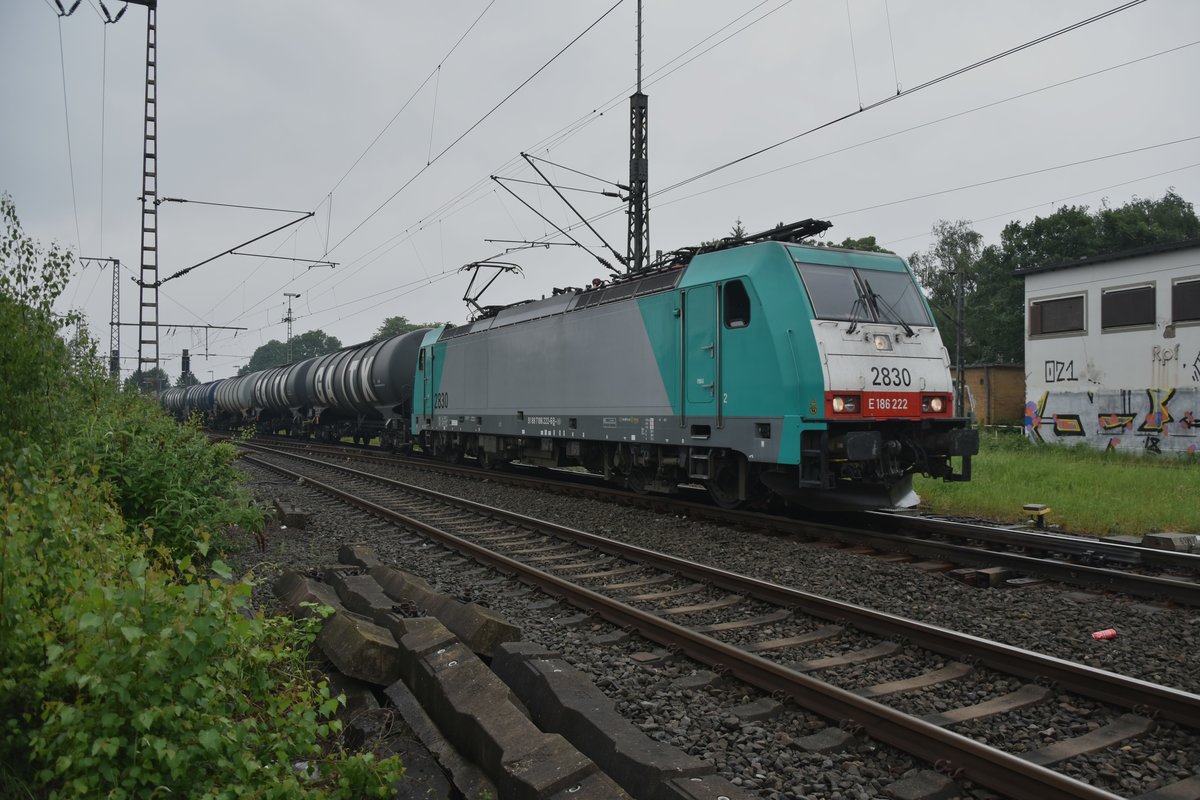 Die für Lineas fahrenden Railpoolloks 186 445-2 und die kalt mitfahrende 186 447-3 kommen mit einem langen Mischer von Odenkirchen in Rheydt eingefahen. 13.5.2018 Andreas Strobel