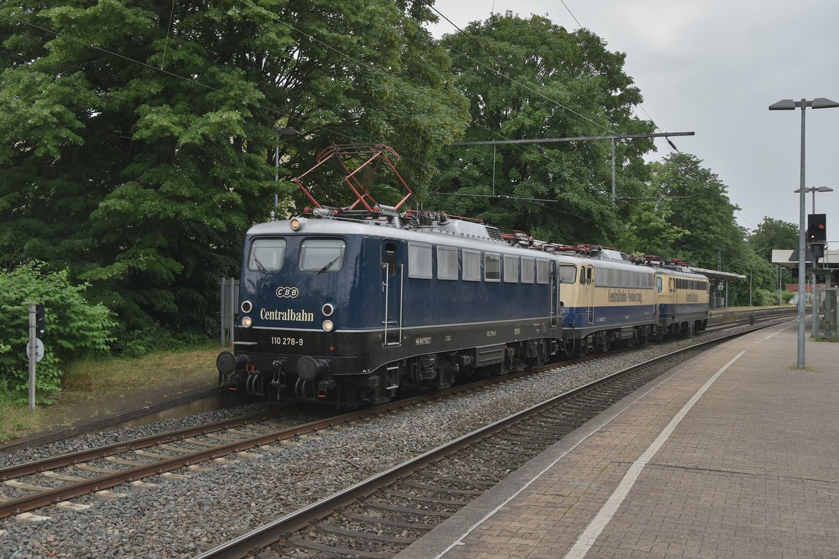 Vor dem HPo zeigenden Ausfahrtsignal von Gleis 1 des Rheydter Hbf steht ein Lokzug der CBB am Mittwoch den 30.5.2018. Vorne am Zug ist die 110 278-9, dann die 110 363 und am Zugschluß ist die 1042 520 angehängt. Andreas Strobel