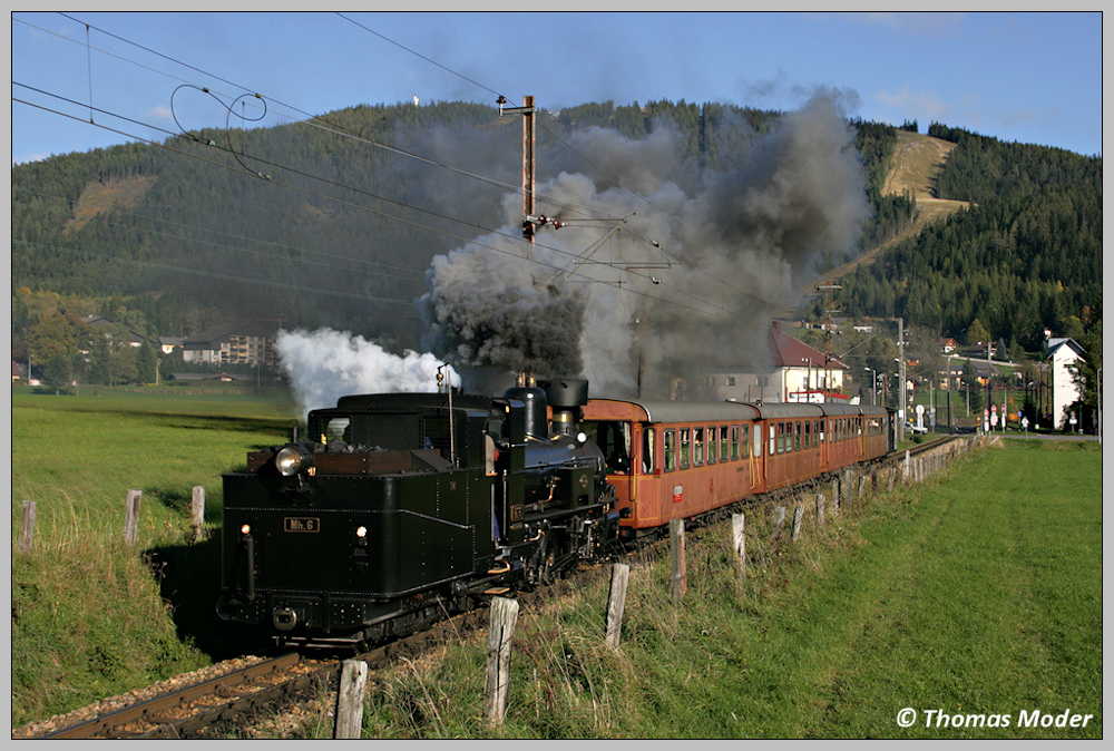 Dampflok Mh.6 fährt mit Sonderzug PANORAMIC 760 von Mariazell nach Ober Grafendorf. "Tender vorraus, oh Graus!!" hab ich mal gehört :-) Schade, dass es in Mariazell keine Drehscheibe gibt, das hätte nämlich zu wesentlich mehr Freude am Foto bereitet.. Thomas M.
