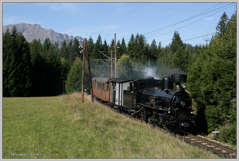 Dampflok Mh.6 zieht den Sonderzug "PANORAMIC 760" von Ober Grafendorf nach Mariazell, aufgenommen vor dem Ötscher nahe der Haltestelle Erlaufklause. 03.10.2010 Thomas M.